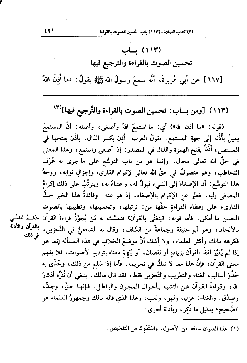 (113) باب تحسين الصوت بالقراءة والترجيع فيها