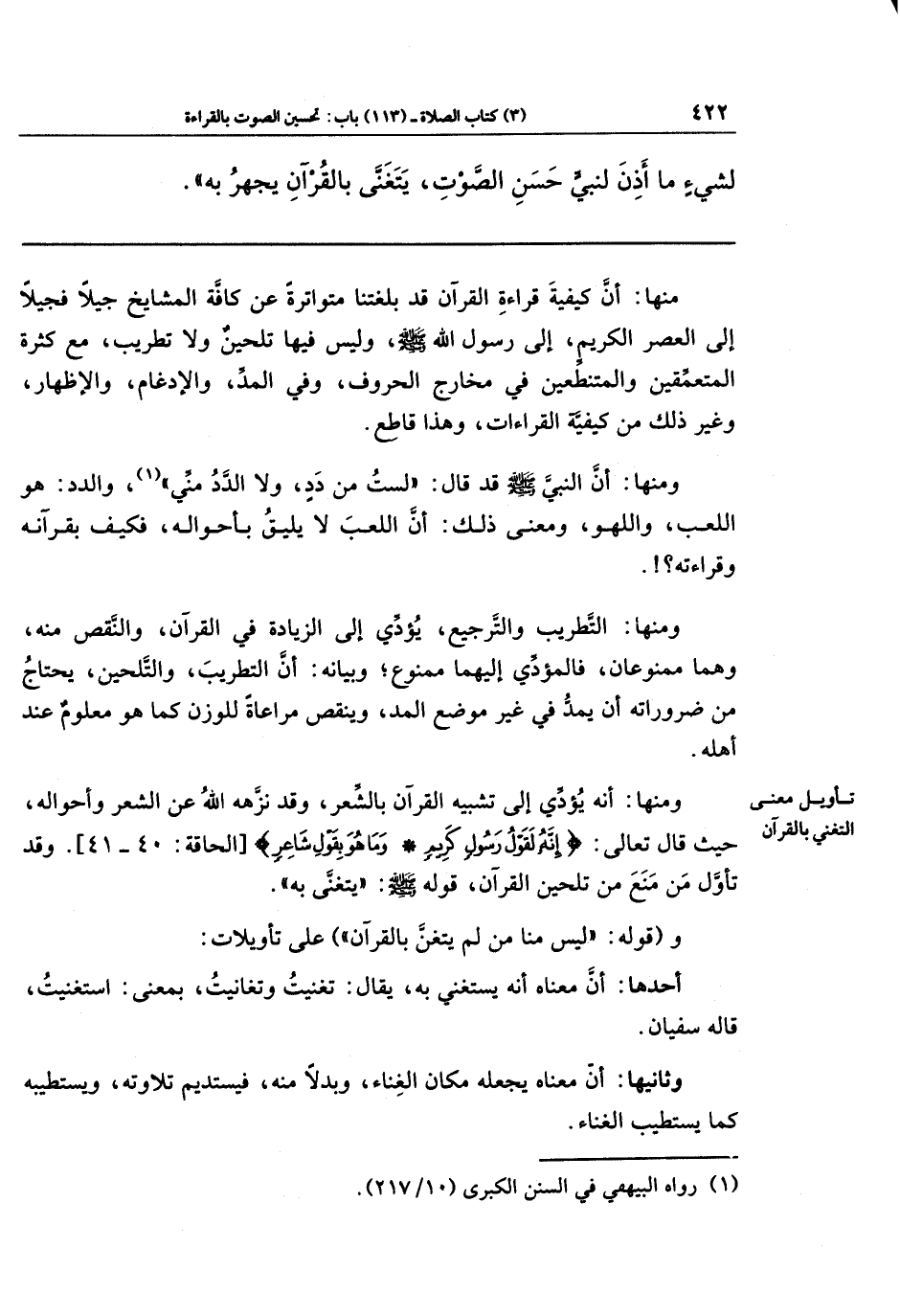 وقد تأوّل من منع من تلحين القرآن، قوله - صلى الله عليه وسلم -: يتغنى به. وقوله: ليس منا من لم يتغن بالقرآن؛ على تأويلات: