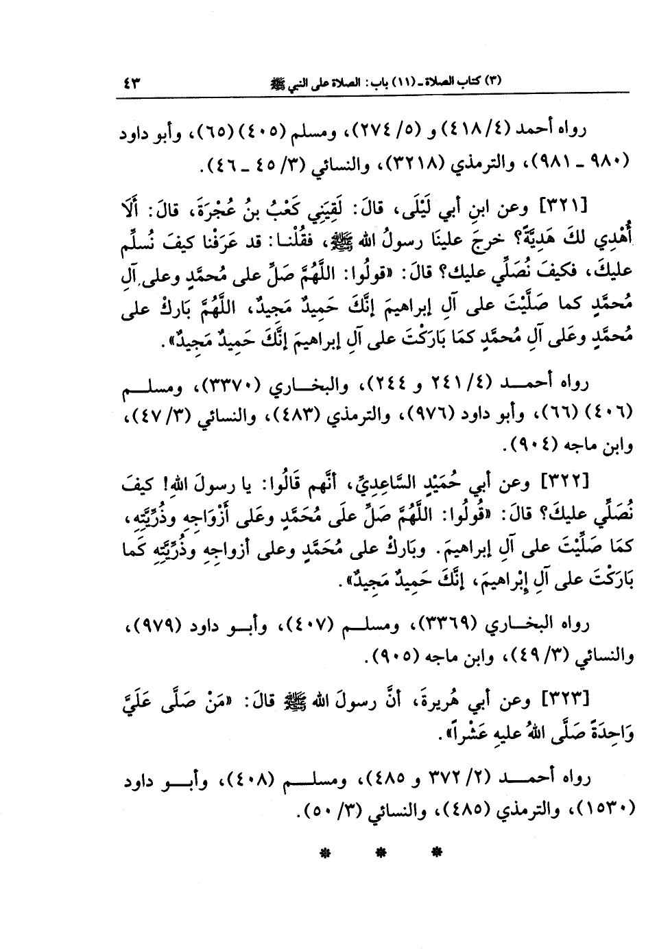 [321]- وَعَن ابنَ أَبِي لَيلَى قَالَ: لَقِيَنِي كَعبُ بنُ عُجرَةَ، قَالَ: أَلا أُهدِي لَكَ هَدِيَّةً؟ خَرَجَ عَلَينَا رَسُولُ اللهِ - صلى الله عليه وسلم - فَقُلنَا: قَد عَرَفنَا كَيفَ نُسَلِّمُ عَلَيكَ، فَكَيفَ نُصَلِّي عَلَيكَ؟ قَالَ: قُولُوا: اللهُمَّ صَلِّ عَلَى مُحَمَّدٍ وَعَلَى آلِ مُحَمَّدٍ كَمَا صَلَّيتَ عَلَى آلِ إِبرَاهِيمَ إِنَّكَ حَمِيدٌ مَجِيدٌ، اللهُمَّ بَارِك عَلَى مُحَمَّدٍ وَعَلَى آلِ مُحَمَّدٍ كَمَا بَارَكتَ عَلَى آلِ إِبرَاهِيمَ إِنَّكَ حَمِيدٌ مَجِيدٌ.
