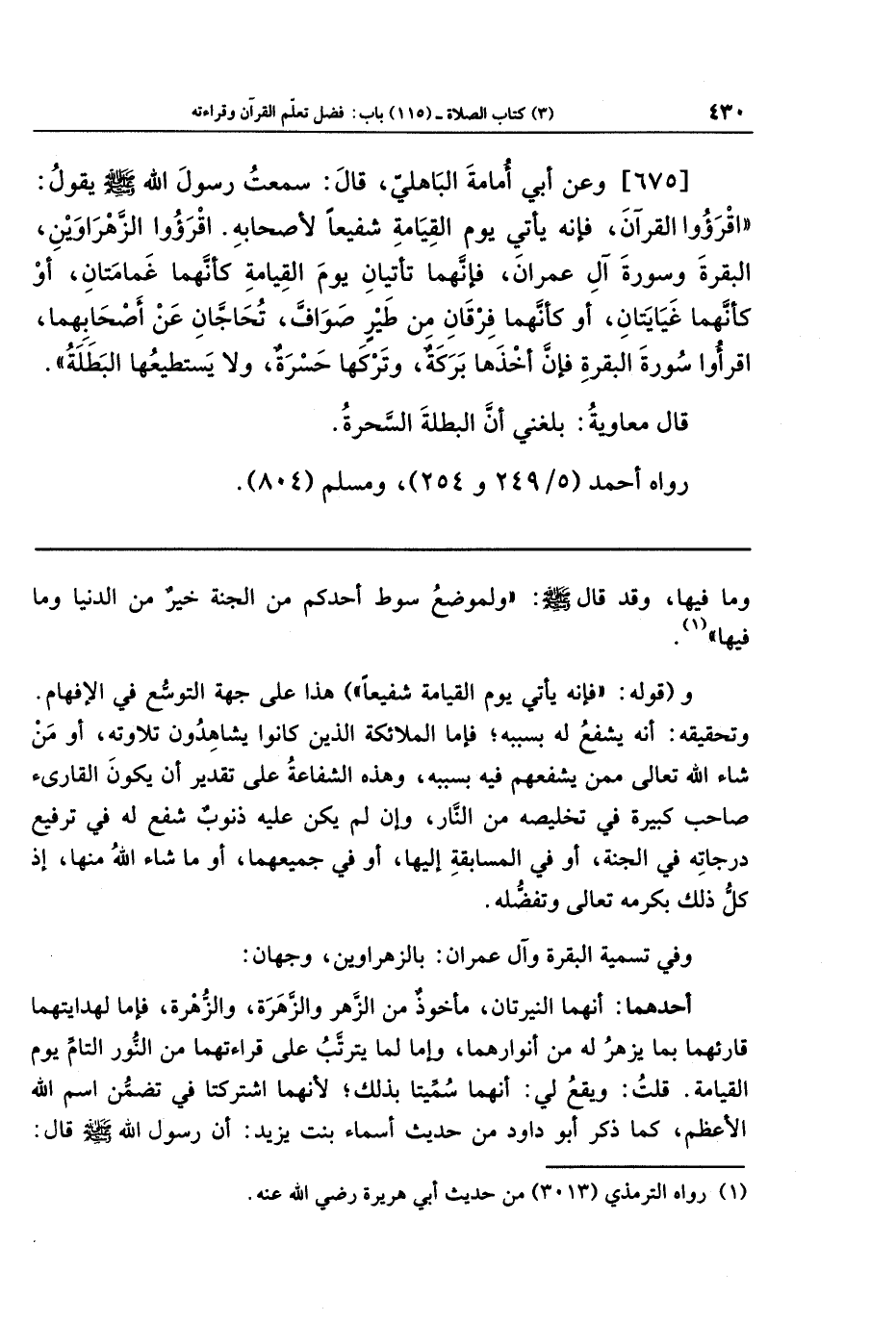 [675]- وَعَن أَبِي أُمَامَةَ البَاهِلِيُّ قَالَ: سَمِعتُ رَسُولَ اللهِ - صلى الله عليه وسلم - يَقُولُ: اقرَؤوا القُرآنَ، فَإِنَّهُ يَأتِي يَومَ القِيَامَةِ شَفِيعًا لأَصحَابِهِ. اقرَؤوا الزَّهرَاوَينِ؛ البَقَرَةَ وَسُورَةَ آلِ عِمرَانَ، فَإِنَّهُمَا تأتِيَانِ يَومَ القِيَامَةِ كَأَنَّهُمَا غَمَامَتَانِ، أَو كَأَنَّهُمَا غَيَايَتَانِ، أَو كَأَنَّهُمَا فِرقَانِ مِن طَيرٍ صَوَافَّ، تُحَاجَّانِ عَن أَصحَابِهِمَا، اقرَؤوا سُورَةَ البَقَرَةِ فَإِنَّ أَخذَهَا بَرَكَةٌ، وَتَركَهَا حَسرَةٌ، وَلا يَستَطِيعُهَا البَطَلَةُ.