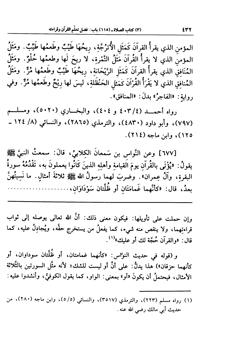 [677]- وَعَنِ النَّوَاس بنِ سِمعَان الكِلابِيَّ قَالَ: سَمِعتُ النَّبِيَ - صلى الله عليه وسلم - يَقُولُ: يُؤتَى بِالقُرآنِ يَومَ القِيَامَةِ وَأَهلِهِ الَّذِينَ كَانُوا يَعمَلُونَ بِهِ، تَقدُمُهُ سُورَةُ البَقَرَةِ وَآلُ عِمرَانَ. وَضَرَبَ لَهُمَا رَسُولُ اللهِ - صلى الله عليه وسلم - ثَلاثَةَ أَمثَالٍ. مَا نَسِيتُهُنَّ بَعدُ، قَالَ: كَأَنَّهُمَا غَمَامَتَانِ أَو ظُلَّتَانِ سَودَاوَانِ،