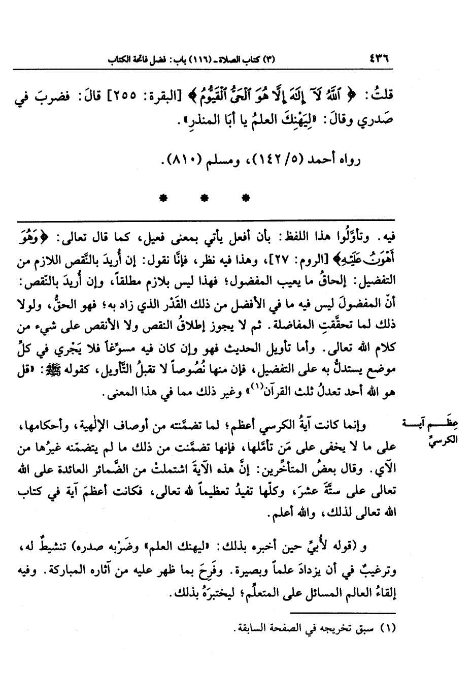 قُلتُ: الله وَرَسُولُهُ أَعلَمُ. قَالَ: يَا أَبَا المُنذِرِ أَتَدرِي أَيُّ آيَةٍ مِن كِتَابِ الله مَعَكَ أَعظَمُ؟ قال: قُلتُ: {اللَّهُ لا إِلَهَ إِلا هُوَ الحَيُّ القَيُّومُ} قَالَ: فَضَرَبَ فِي صَدرِي وَقَالَ: لِيَهنِكَ العِلمُ أَبَا المُنذِرِ.