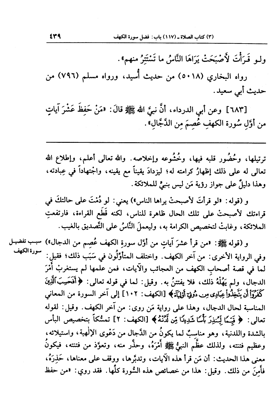 وقوله - صلى الله عليه وسلم -: من قرأ عشر آيات من أول سورة الكهف عصم من الدجال. وفي الرواية الأخرى: من آخر الكهف. واختلف المتأوِّلون في سبب ذلك؛ فقيل: لما في قصة أصحاب الكهف من العجائب والآيات، فمن علمها لم يستغرب أمر الدجال، ولم يَهُلهُ ذلك، فلا يفتتن به. وقيل: لما في قوله - تعالى -: {أَفَحَسِبَ الَّذِينَ كَفَرُوا أَن يَتَّخِذُوا عِبَادِي مِن دُونِي أَولِيَاءَ} - إلى آخر السورة - من المعاني المناسبة لحال الدجّال، وهذا على رواية من روى: من آخر الكهف. وقيل: لقوله - تعالى -: {قَيِّمًا لِيُنذِرَ بَأسًا شَدِيدًا مِن لَدُنهُ}؛ تمسُّكًا بتخصيص البأس بالشدة واللدنِّية، وهو مناسب لما يكون من الدجال من دعوى الإلهية، واستيلائه، وعظيم فتنته، ولذلك عظَّم النبي - صلى الله عليه وسلم - أمره، وحذّر منه، وتعوّذ من فتنته. فيكون معنى هذا الحديث: أن من قرأ هذه الآيات وتدبرها، ووقف على معناها؛ حذره، فأمن من ذلك. وقيل: هذا من خصائص هذه السورة كلها، فقد روي: من حفظ