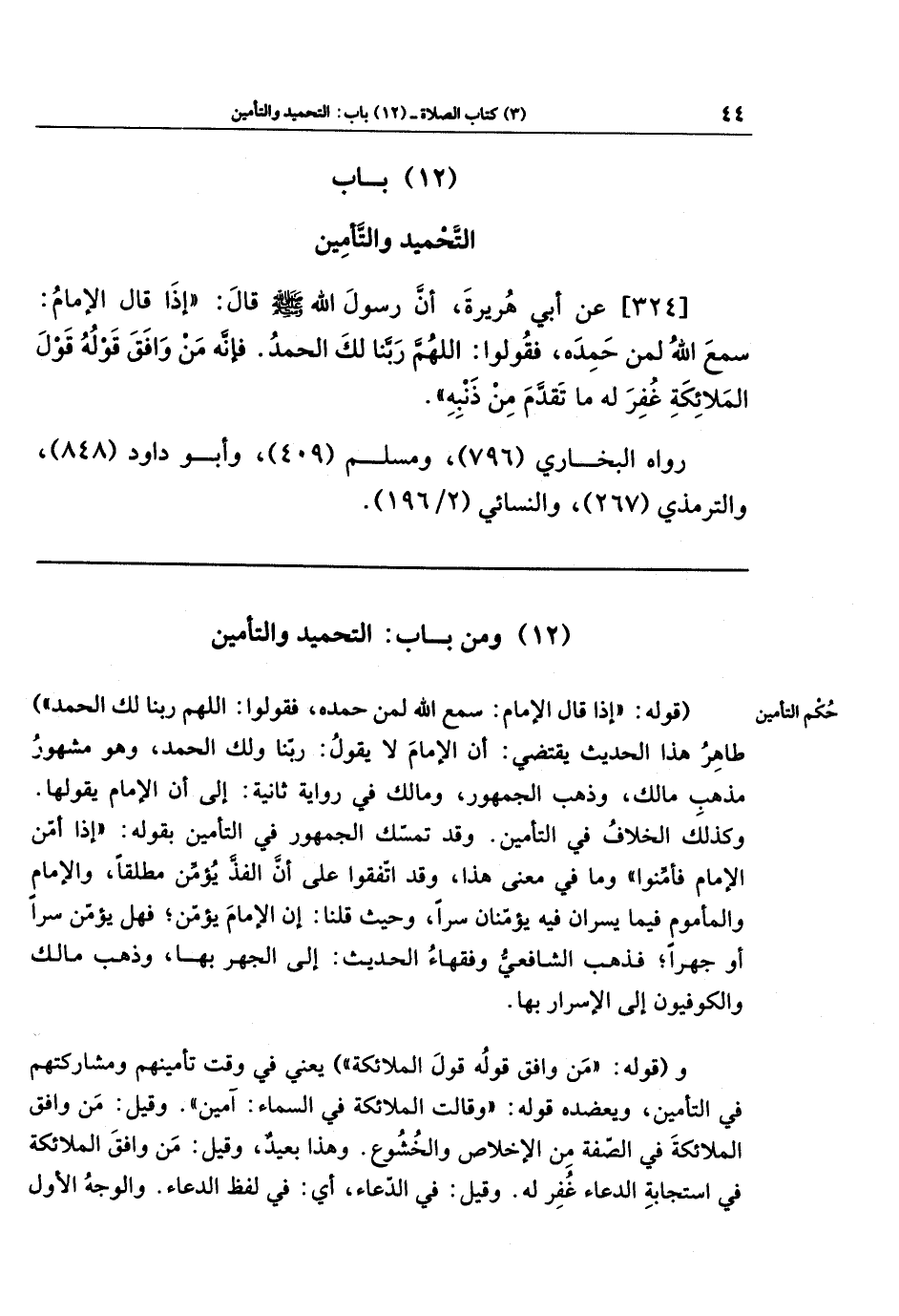[324]- عَن أَبِي هُرَيرَةَ أَنَّ رَسُولَ اللهِ - صلى الله عليه وسلم - قَالَ: إِذَا قَالَ الإِمَامُ سَمِعَ اللهُ لِمَن حَمِدَهُ، فَقُولُوا: اللهم رَبَّنَا لَكَ الحَمدُ، فَإِنَّهُ مَن وَافَقَ قَولُهُ قَولَ المَلائِكَةِ غُفِرَ لَهُ مَا تَقَدَّمَ مِن ذَنبِهِ.