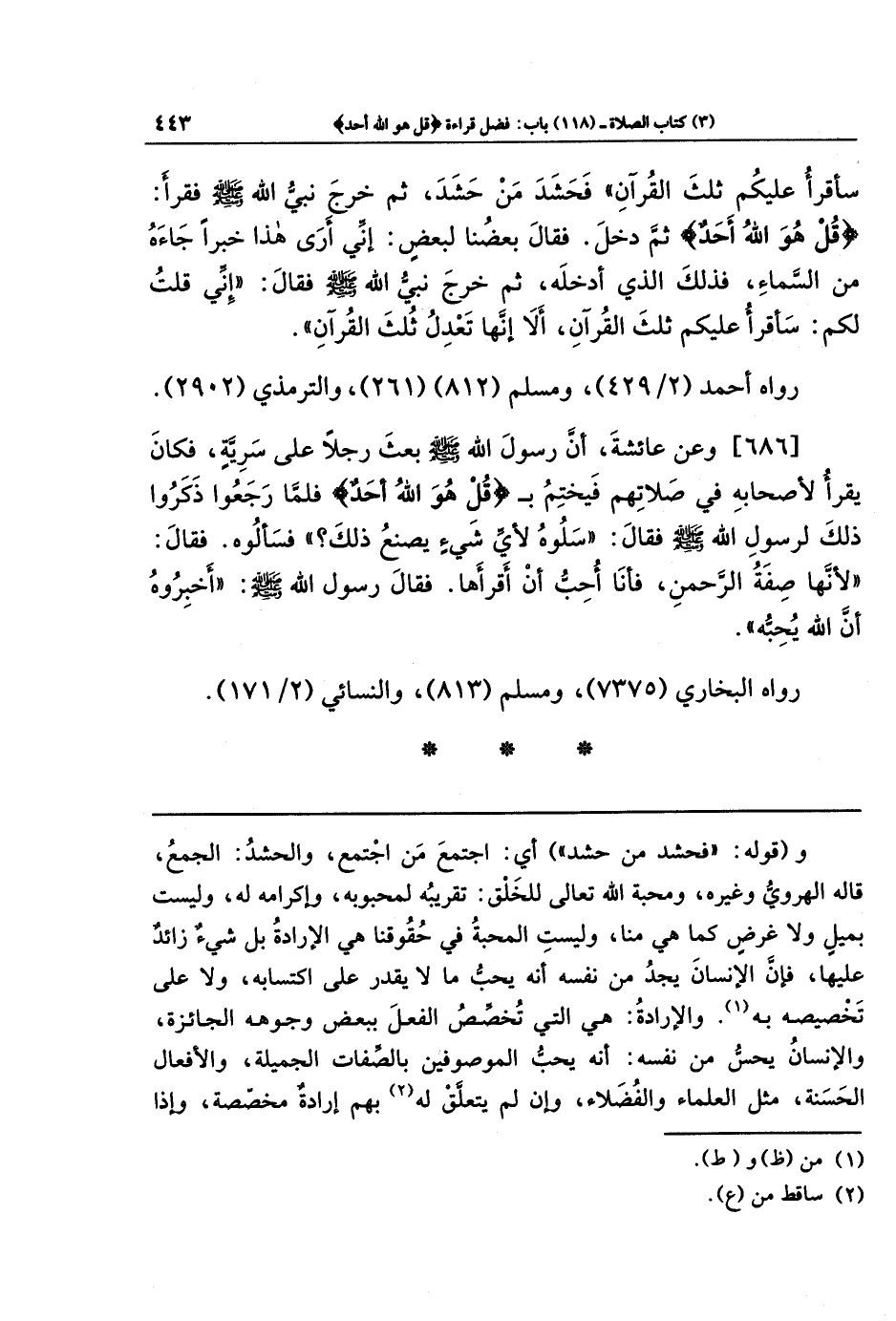 [686]- وعَن عَائِشَةَ: أَنَّ رَسُولَ اللهِ - صلى الله عليه وسلم - بَعَثَ رَجُلا عَلَى سَرِيَّةٍ، فَكَانَ يَقرَأُ لأَصحَابِهِ فِي صَلاتِهِم فَيَختِمُ بـ {قُل هُوَ اللَّهُ أَحَدٌ} فَلَمَّا رَجَعُوا ذُكِرَوا ذَلِكَ لِرَسُولِ اللهِ - صلى الله عليه وسلم - فَقَالَ: سَلُوهُ لأَيِّ شَيءٍ يَصنَعُ ذَلِكَ؟ فَسَأَلُوهُ. فَقَالَ لأَنَّهَا صِفَةُ الرَّحمَنِ، فَأَنَا أُحِبُّ أَن أَقرَأَهَا. فَقَالَ رَسُولُ اللهِ - صلى الله عليه وسلم -: أَخبِرُوهُ أَنَّ الله يُحِبُّهُ.