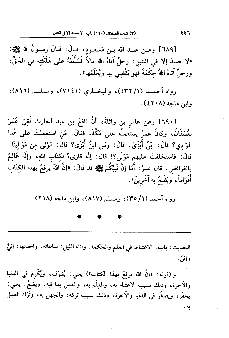 [689]- وَعَن عَبدَ الله بنَ مَسعُودٍ قَالَ: قَالَ رَسُولُ اللهِ - صلى الله عليه وسلم -: لا حَسَدَ إِلا فِي اثنَتَينِ: رَجُلٌ آتَاهُ الله مَالا فَسَلَّطَهُ عَلَى هَلَكَتِهِ فِي الحَقِّ، وَرَجُلٌ آتَاهُ الله حِكمَةً فَهُوَ يَقضِي بِهَا وَيُعَلِّمُهَا.