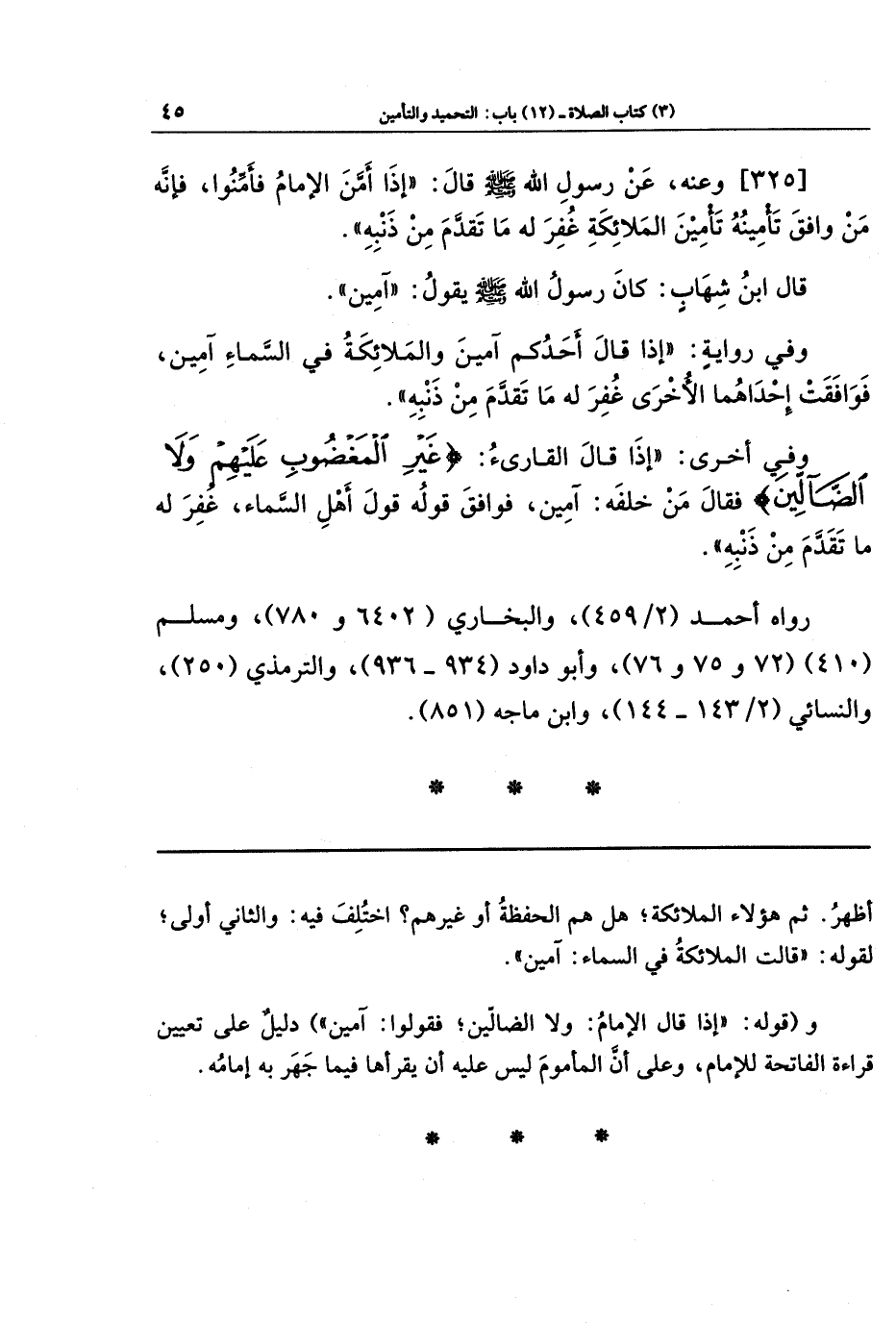 [325]- وَعَنهُ، عَن رَسُولَ اللهِ - صلى الله عليه وسلم - قَالَ: إِذَا أَمَّنَ الإِمَامُ فَأَمِّنُوا، فَإِنَّهُ مَن وَافَقَ تَأمِينُهُ تَأمِينَ المَلائِكَةِ غُفِرَ لَهُ مَا تَقَدَّمَ مِن ذَنبِهِ.