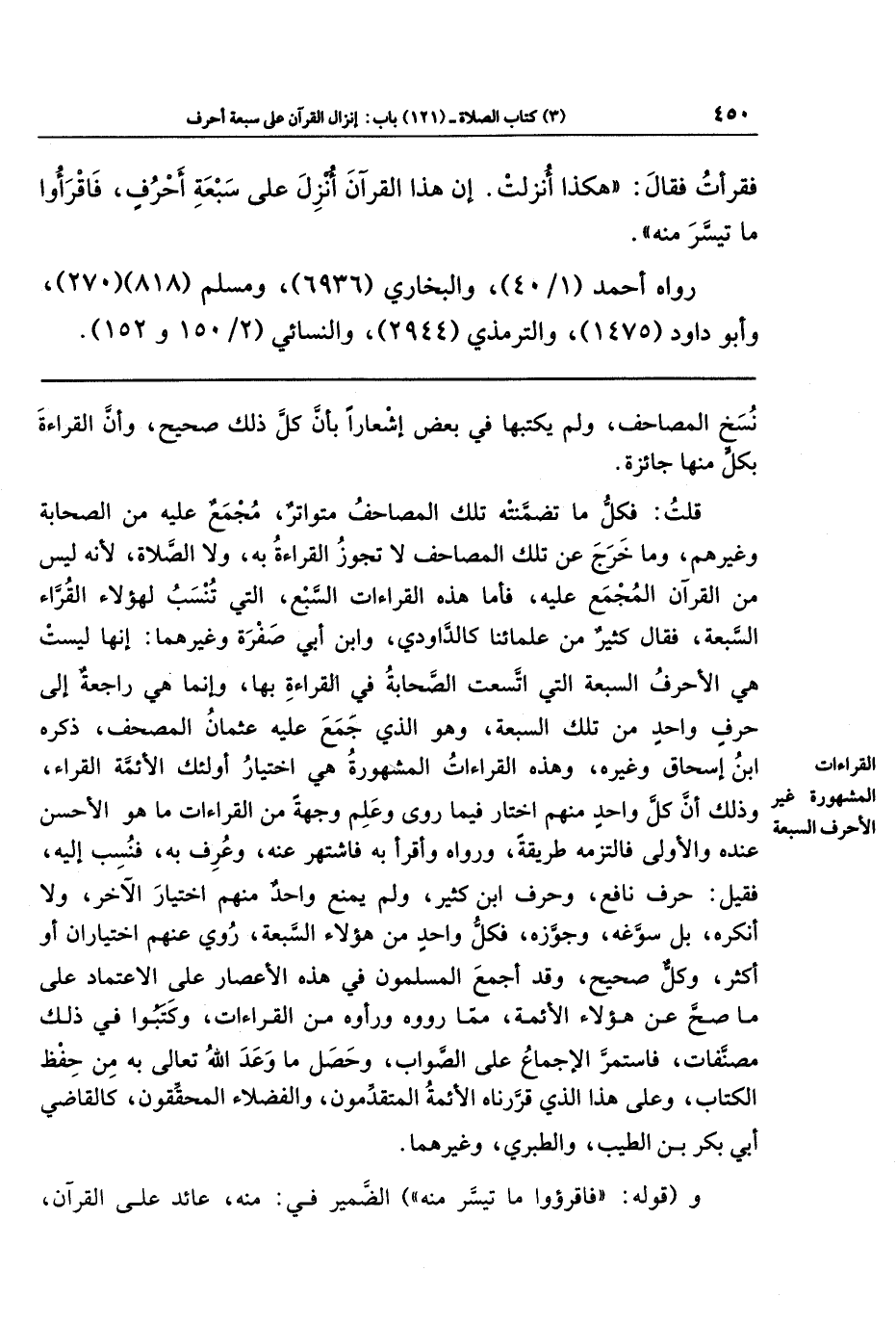 فَقَرَأتُ فَقَالَ: هَكَذَا أُنزِلَت. إِنَّ هَذَا القُرآنَ أُنزِلَ عَلَى سَبعَةِ أَحرُفٍ، فَاقرَؤوا مَا تَيَسَّرَ مِنهُ.