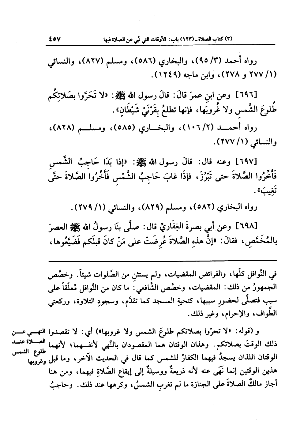 [696]- وعَنِ ابنِ عُمَرَ قَالَ: قَالَ رَسُولُ اللهِ - صلى الله عليه وسلم -: لا تَحَرَّوا بِصَلاتِكُم طُلُوعَ الشَّمسِ وَلا غُرُوبَهَا، فَإِنَّهَا تَطلُعُ بِقَرنَي شَيطَانٍ.