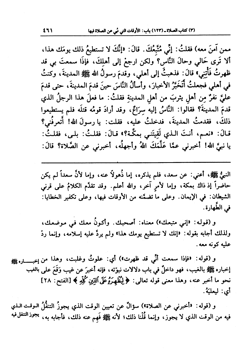 مِمَّن آمَنَ مَعَهُ). فَقُلتُ: إِنِّي مُتَّبِعُكَ. قَالَ: إِنَّكَ لا تَستَطِيعُ ذَلِكَ يَومَكَ هَذَا، أَلا تَرَى حَالِي وَحَالَ النَّاسِ؟ وَلَكِنِ ارجِع إِلَى أَهلِكَ، فَإِذَا سَمِعتَ بِي قَد ظَهَرتُ فَأتِنِي قَالَ: فَذَهَبتُ إِلَى أَهلِي، وَقَدِمَ رَسُولُ اللهِ - صلى الله عليه وسلم - المَدِينَةَ، وَكُنتُ فِي أَهلِي فَجَعَلتُ أَتَخَبَّرُ الأَخبَارَ، وَأَسأَلُ النَّاسَ حِينَ قَدِمَ المَدِينَةَ، حَتَّى قَدِمَ عَلَيَّ نَفَرٌ مِن أَهلِ يَثرِبَ مِن أَهلِ المَدِينَةَ فَقُلتُ: مَا فَعَلَ هَذَا الرَّجُلُ الَّذِي قَدِمَ المَدِينَةَ؟ فَقَالُوا: النَّاسُ إِلَيهِ سِرَاعٌ، وَقَد أَرَادَ قَومُهُ قَتلَهُ فَلَم يَستَطِيعُوا ذَلِكَ، فَقَدِمتُ المَدِينَةَ، فَدَخَلتُ عَلَيهِ فَقُلتُ: يَا رَسُولَ اللهِ! أَتَعرِفُنِي؟ قَالَ: نَعَم، أَنتَ الَّذِي لَقِيتَنِي بِمَكَّةَ؟ قَالَ: فَقُلتُ: بَلَى، فَقُلتُ: يَا نَبِيَّ الله! أَخبِرنِي عَمَّا عَلَّمَكَ الله وَأَجهَلُهُ، أَخبِرنِي عَنِ الصَّلاةِ؟ قَالَ: