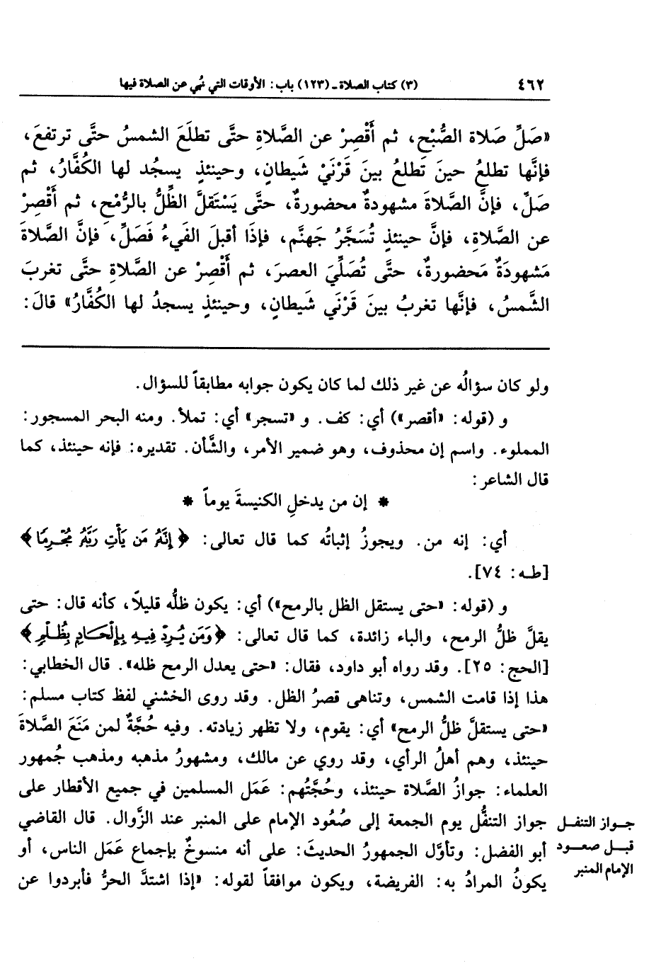 وقوله: حتى يستقل الظل بالرمح؛ أي: يكون ظلُّه قليلا، كأنه قال: حتى يقل ظل الرمح، والباء زائدة؛ كما قال - تعالى -: وَمَن يُرِد فِيهِ بِإِلحَادٍ بِظُلمٍ. وقد رواه أبو داود، فقال: حتى يعدل الرمح ظله. قال الخطابي: هذا إذا قامت الشمس، وتناهى قصر الظل. وقد روى الخشني لفظ كتاب مسلم: حتى يستقلّ ظل الرمح؛ أي: يقوم، ولا تظهر زيادته. وفيه حجة لمن منع الصلاة حينئذ؛ وهم أهل الرأي، وقد روي عن مالك، ومشهور مذهبه ومذهب جمهور العلماء: جواز الصلاة حينئذٍ، وحجتهم: عمل المسلمين في جميع الأقطار على جواز التنفُّل يوم الجمعة إلى صعود الإمام على المنبر عند الزوال. قال القاضي أبو الفضل: وتأوّل الجمهور الحديث: على أنه منسوخ بإجماع عمل الناس، أو يكون المراد به: الفريضة، ويكون موافقًا لقوله: إذا اشتد الحرّ فأبردوا عن