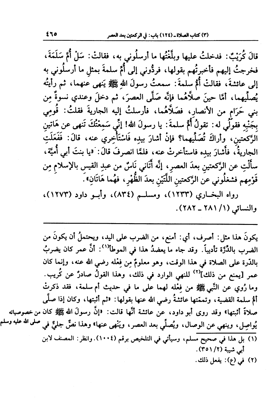 وما رُوي عن النبي - صلى الله عليه وسلم - من فعله لهما على ما في حديث أم سلمة؛ فقد ذكرت أم سلمة القضية، وتممتها عائشة - رضي الله عنها - بقولها: ثم أثبتها، وكان إذا صلّى صلاة أثبتها، وقد روى أبو داود عن عائشة أنها قالت: إن رسول الله - صلى الله عليه وسلم - كان يُواصل وينهى عن الوصال، ويصلّي بعد العصر، وينهى عنها، وهذا نصٌ جليٌ في