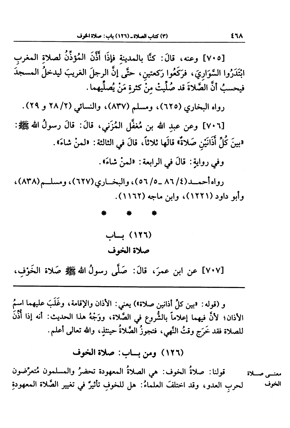 [707]- عَنِ ابنِ عُمَرَ قَالَ: صَلَّى رَسُولُ اللهِ - صلى الله عليه وسلم - صَلاةَ الخَوفِ،