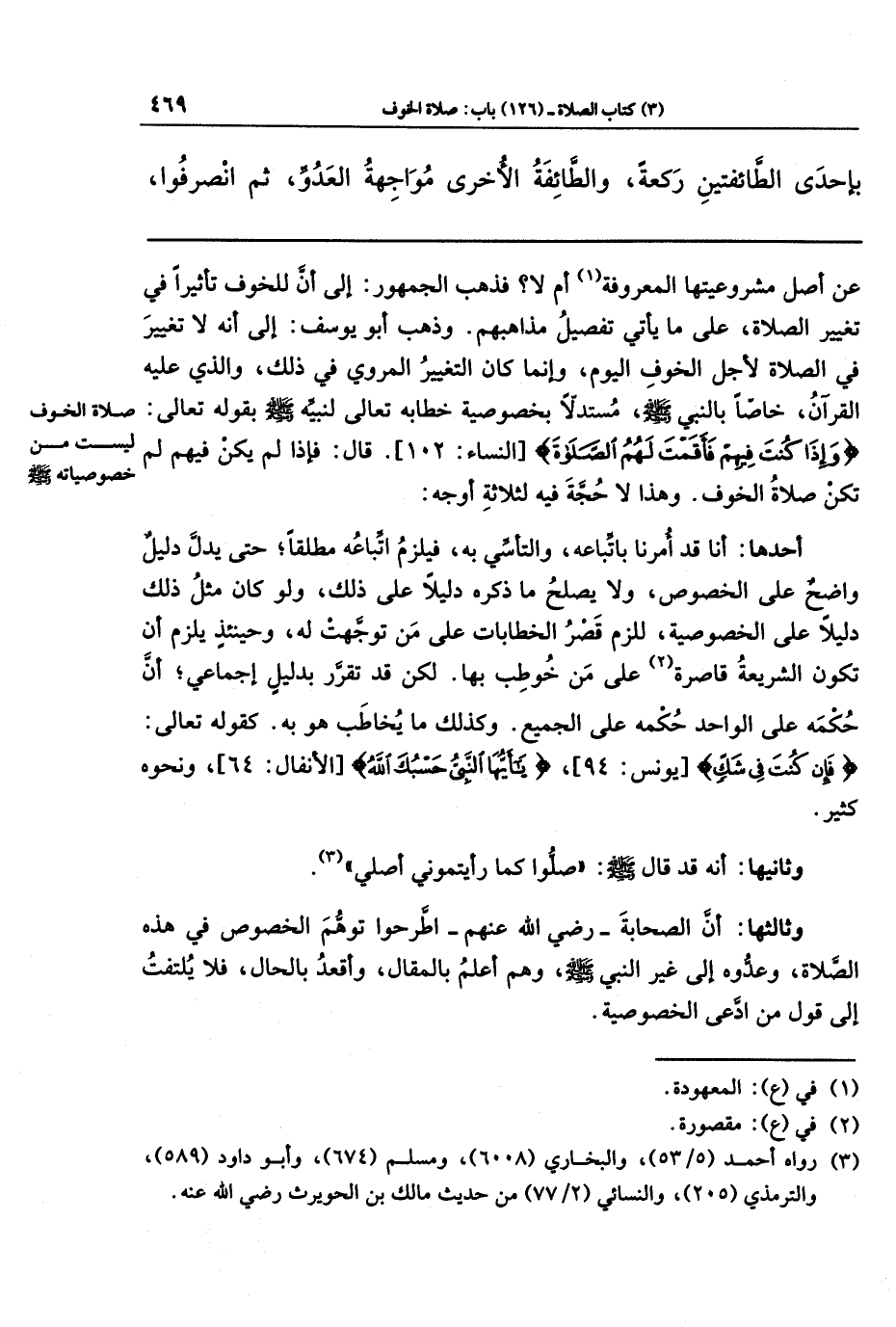 عن أصل مشروعيتها المعروفة (¬1) أم لا؟ فذهب الجمهور إلى أن للخوف تأثيرا في تغيير الصلاة، على ما يأتي تفصيل مذاهبهم. وذهب أبو يوسف إلى أنه لا تغيير في الصلاة لأجل الخوف اليوم، وإنما كان التغيير المروي في ذلك، والذي عليه القرآن، خاصًّا بالنبي - صلى الله عليه وسلم - مستدلا بخصوصية خطابه تعالى لنبيه - صلى الله عليه وسلم - بقوله تعالى: {وَإِذَا كُنتَ فِيهِم فَأَقَمتَ لَهُمُ الصَّلاةَ} قال: فإذا لم يكن فيهم لم تكن صلاة الخوف. وهذا لا حجة فيه لثلاثة أوجه: