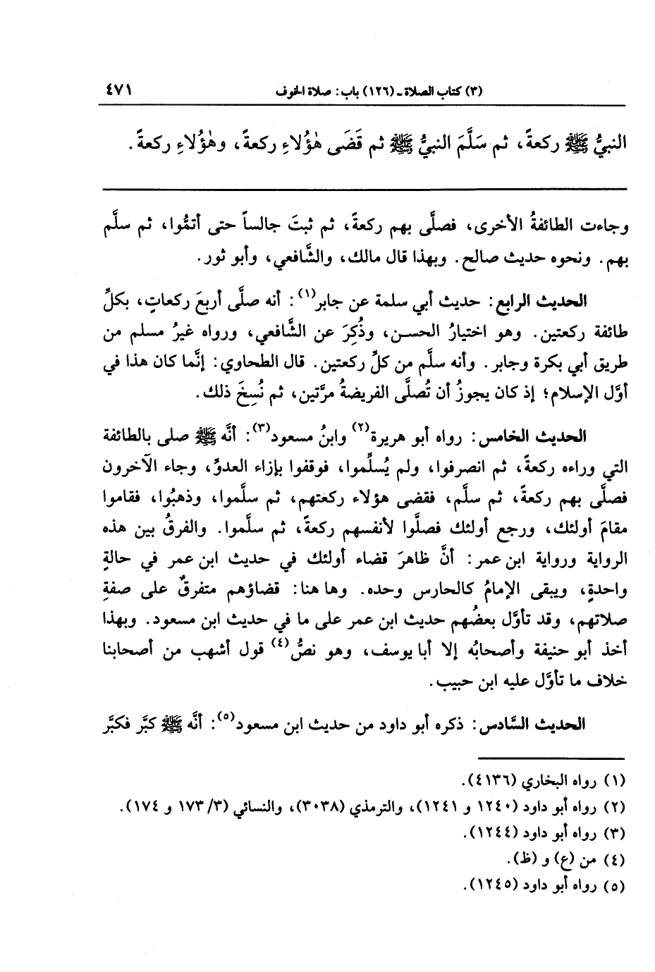 الحديث الرابع: حديث أبي سلمة عن جابر (¬1): أنه صلى أربع ركعات، بكل طائفة ركعتين، وهو اختيار الحسن، وذُكر عن الشافعي، ورواه غير مسلم من طريق أبي بكرة وجابر. وأنه سلم من كل ركعتين. قال الطحاوي: إنما كان هذا في أول الإسلام؛ إذ كان يجوز أن تُصلى الفريضة مرتين، ثم نُسخ ذلك.
