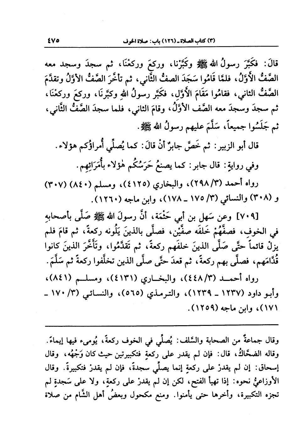 [709]- وعَن سَهلِ بنِ أَبِي حَثمَةَ: أَنَّ رَسُولَ اللهِ - صلى الله عليه وسلم - صَلَّى بِأَصحَابِهِ فِي الخَوفِ، فَصَفَّهُم خَلفَهُ صَفَّينِ، فَصَلَّى بِالَّذِينَ يَلُونَهُ رَكعَةً، ثُمَّ قَامَ فَلَم يَزَل قَائِمًا حَتَّى صَلَّى الَّذِينَ خَلفَهُم رَكعَةً، ثُمَّ تَقَدَّمُوا، وَتَأَخَّرَ الَّذِينَ كَانُوا قُدَّامَهُم، فَصَلَّى بِهِم رَكعَةً، ثُمَّ قَعَدَ حَتَّى صَلَّى الَّذِينَ تَخَلَّفُوا رَكعَةً ثُمَّ سَلَّمَ.
