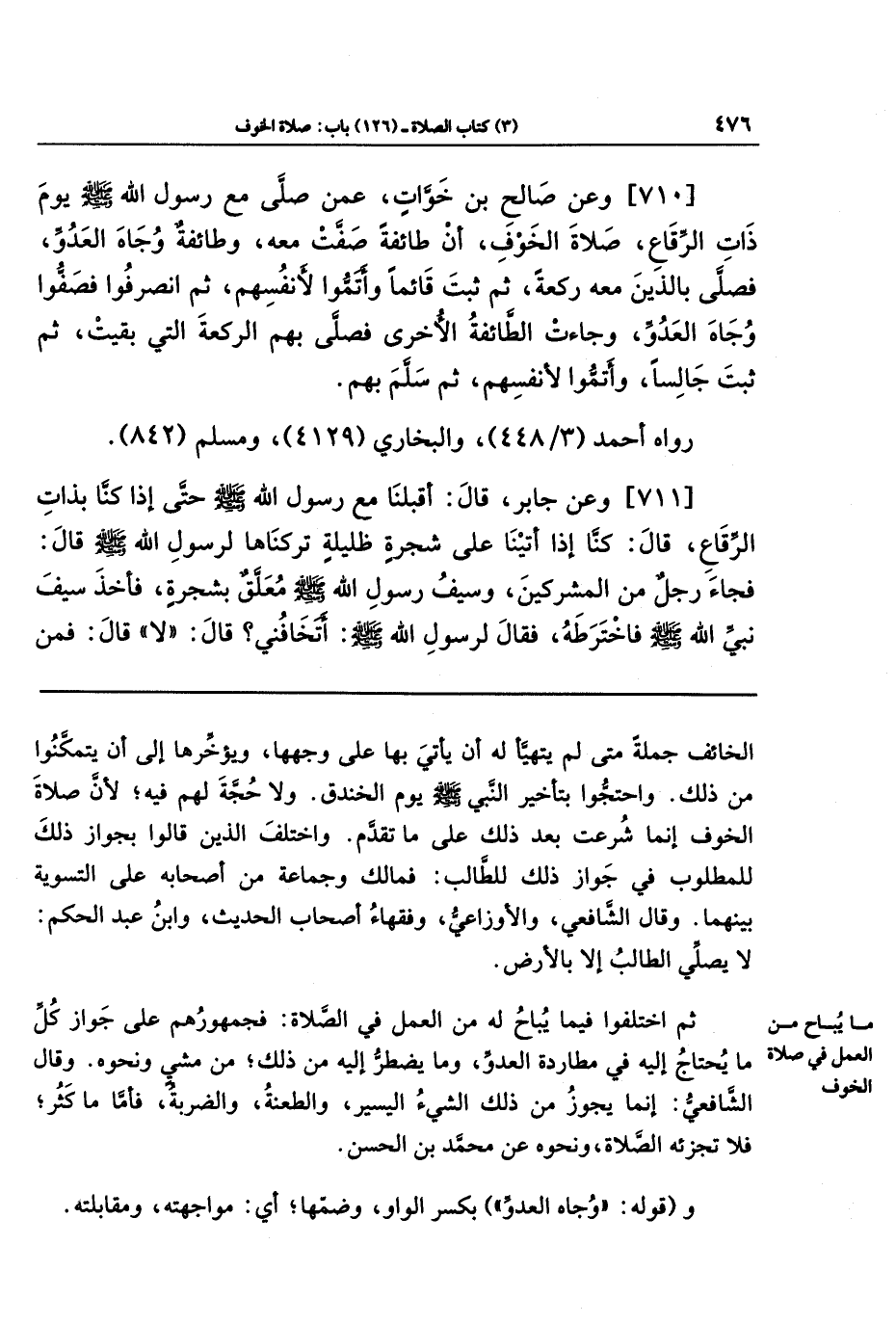 [710]- وَعَن صَالِح بنِ خَوَّات، عَمن صَلَّىَ مَعَ رَسُولِ اللهِ - صلى الله عليه وسلم - يَومَ ذَاتِ الرِّقَاعِ، صَلاةَ الخَوفِ، أَنَّ طَائِفَةً صَفَّت مَعَهُ، وَطَائِفَةٌ وِجَاهَ العَدُوِّ، فَصَلَّى بِالَّذِينَ مَعَهُ رَكعَةً، ثُمَّ ثَبَتَ قَائِمًا وَأَتَمُّوا لأَنفُسهُم، ثُمَّ انصَرَفُوا فَصَفُّوا وِجَاهَ العَدُوِّ، وَجَاءَتِ الطَّائِفَةُ الأُخرَى فَصَلَّى بِهِمُ الرَّكعَةَ الَّتِي بَقِيَت، ثُمَّ ثَبَتَ جَالِسًا، وَأَتَمُّوا لأَنفُسِهِم، ثُمَّ سَلَّمَ بِهِم.