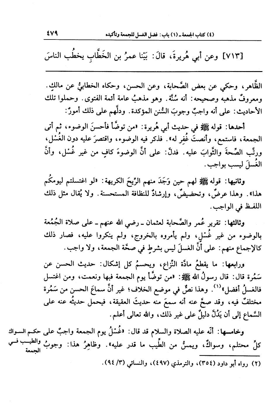 وثالثها: تقرير عمر والصحابة لعثمان - رضي الله عنهم - على صلاة الجمعة بالوضوء من غير غسل، ولم يأمروه بالخروج، ولم ينكروا عليه، فصار ذلك كالإجماع منهم على أن الغسل ليس بشرط في صحة الجمعة، ولا واجب.