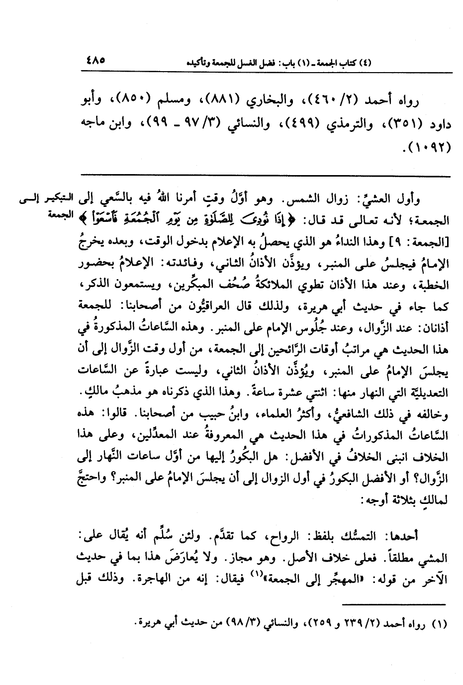 أحدها: التمسك بلفظ: الرواح، كما تقدم. ولئن سُلِّم أنه يُقال على المشي مطلقًا؛ فعلى خلاف الأصل، وهو مجاز. ولا يُعارضُ هذا بما في حديث الآخر من قوله: المهجِّر إلى الجمعة (¬1)، فيقال: إنه من الهاجرة، وذلك قبل