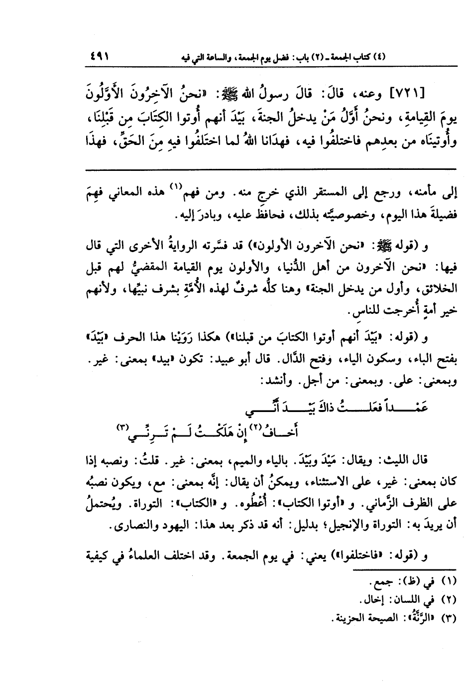 [721]- وَعَنهُ قَالَ: قَالَ رَسُولُ اللهِ - صلى الله عليه وسلم -: نَحنُ الآخِرُونَ الأَوَّلُونَ يَومَ القِيَامَةِ، وَنَحنُ أَوَّلُ مَن يَدخُلُ الجَنَّةَ، بَيدَ أَنَّهُم أُوتُوا الكِتَابَ مِن قَبلِنَا، وَأُوتِينَاهُ مِن بَعدِهِم فَاختَلَفُوا فِيهِ، فَهَدَانَا الله لِمَا اختَلَفُوا فِيهِ مِنَ الحَقِّ، فَهَذَا