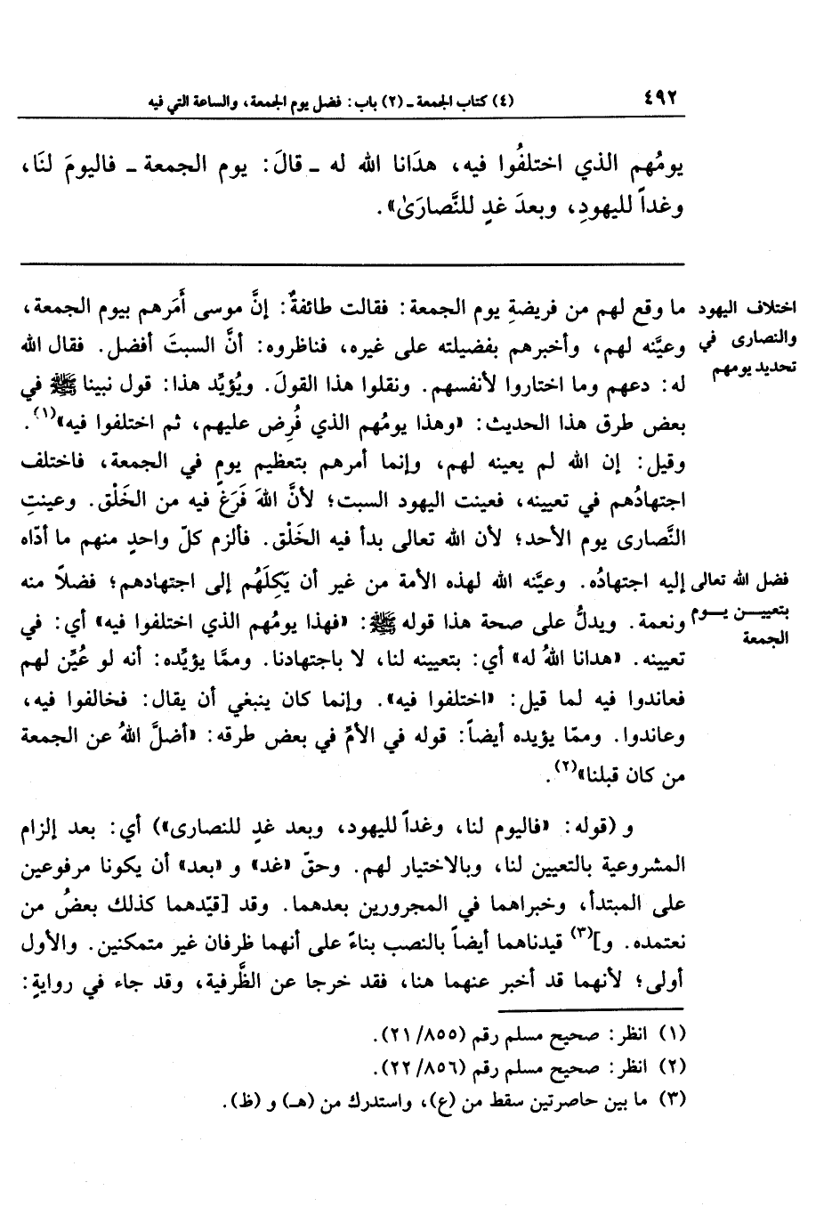 يَومُهُمِ الَّذِي اختَلَفُوا فِيهِ، هَدَانَا الله لَهُ - قَالَ: يَومُ الجُمُعَةِ - فَاليَومَ لَنَا، وَغَدًا لِليَهُودِ، وَبَعدَ غَدٍ لِلنَّصَارَى.