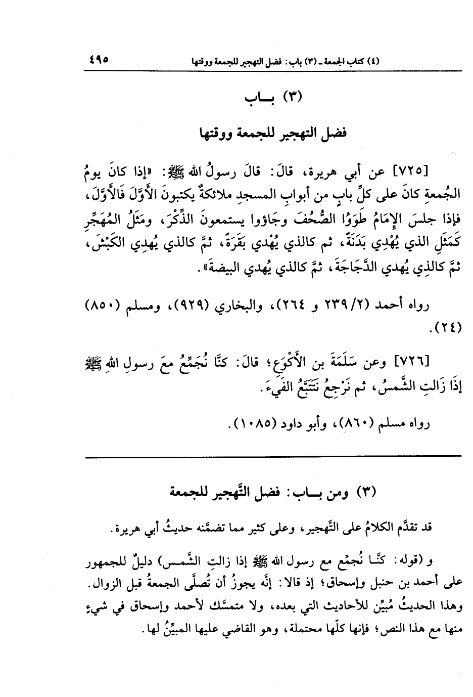[726]- وَعَن سَلَمَةَ بنِ الأَكوَعِ قَالَ: كُنَّا نُجَمِّعُ مَعَ رَسُولِ اللهِ - صلى الله عليه وسلم - إِذَا زَالَتِ الشَّمسُ، ثُمَّ نَرجِعُ نَتَتَبَّعُ الفَيءَ.