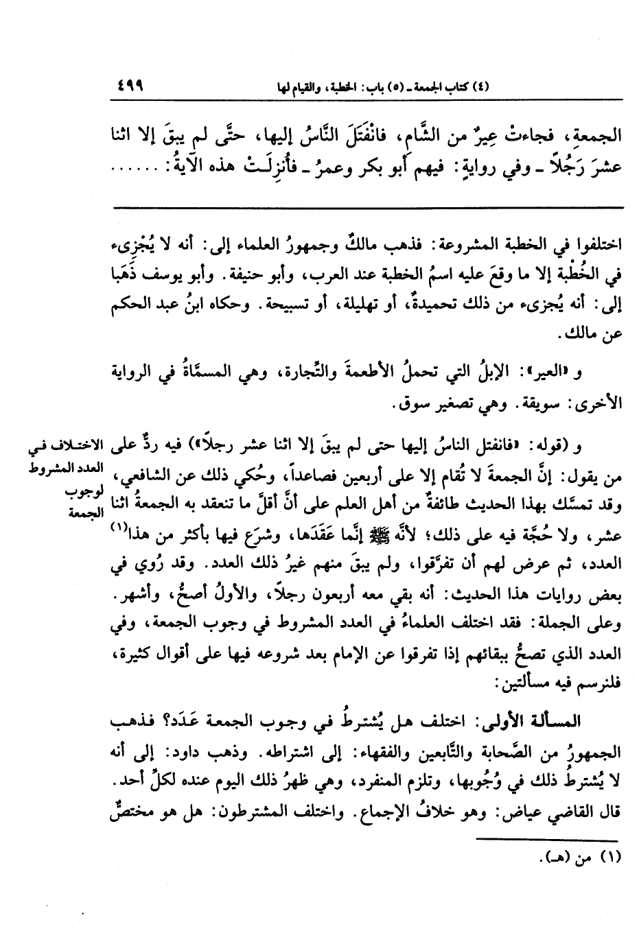 المسألة الأولى: اختلف هل يُشترط في وجوب الجمعة عدد؟ فذهب الجمهور من الصحابة والتابعين والفقهاء إلى اشتراطه، وذهب داود إلى أنه لا يُشترط ذلك في وجوبها، وتلزم المنفرد، وهي ظهرُ ذلك اليوم عنده لكل أحد. قال القاضي عياض: وهو خلافُ الإجماع. واختلف المشترطون: هل هو مختصٌ