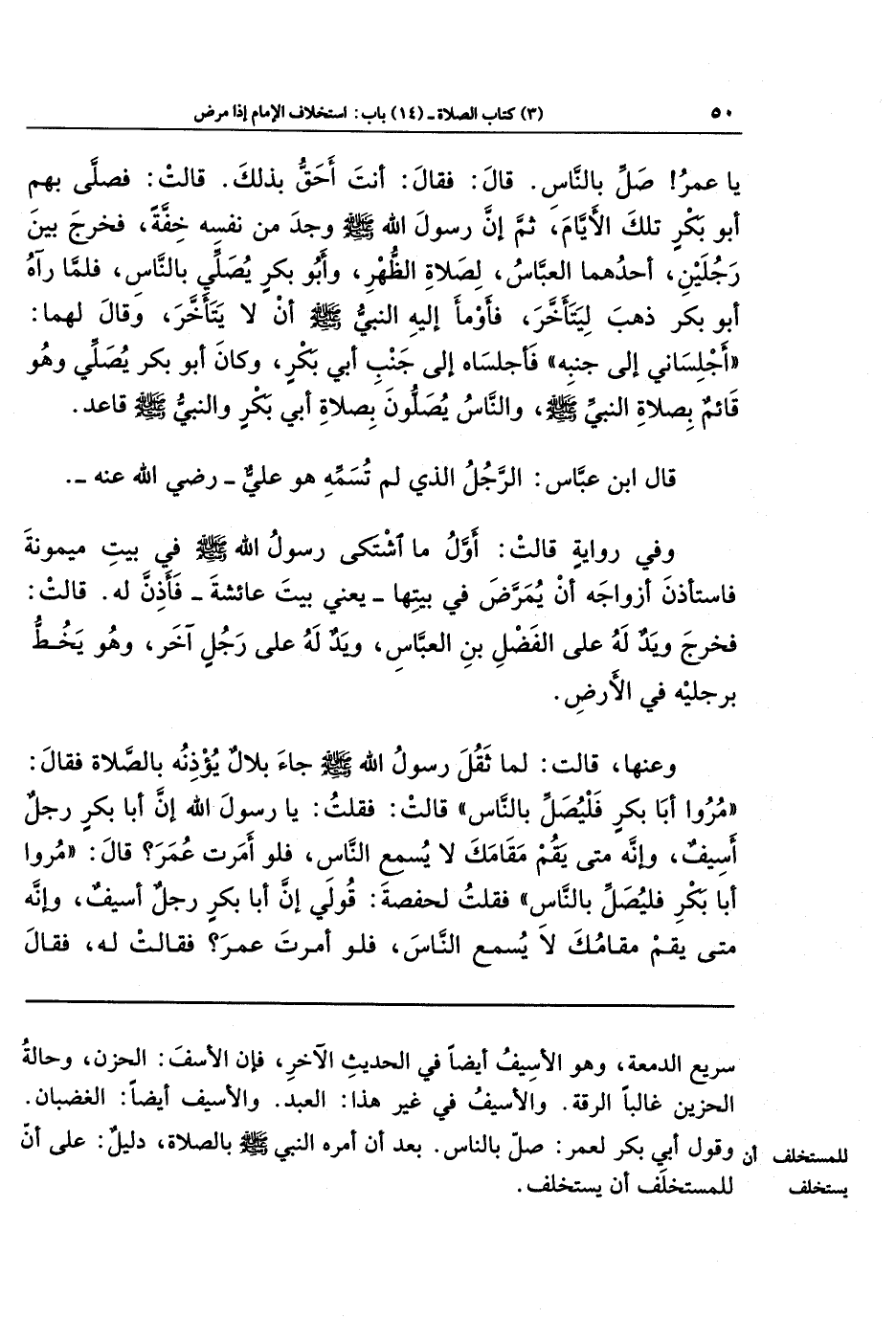 يَا عُمَرُ، صَلِّ بِالنَّاسِ! قَالَ: فَقَالَ أَنتَ أَحَقُّ بِذَلِكَ! قَالَت: فَصَلَّى بِهِم أَبُو بَكرٍ تِلكَ الأَيَّامَ، ثُمَّ إِنَّ رَسُولَ اللهِ - صلى الله عليه وسلم - وَجَدَ مِن نَفسِهِ خِفَّةً، فَخَرَجَ بَينَ رَجُلَينِ - أَحَدُهُمَا العَبَّاسُ - لِصَلاةِ الظُّهرِ، وَأَبُو بَكرٍ يُصَلِّي بِالنَّاسِ، فَلَمَّا رَآهُ أَبُو بَكرٍ ذَهَبَ لِيَتَأَخَّرَ، فَأَومَأَ إِلَيهِ النَّبِيُّ - صلى الله عليه وسلم - أَن لا يَتَأَخَّرَ، وَقَالَ لَهُمَا: أَجلِسَانِي إِلَى جَنبِهِ - فَأَجلَسَاهُ إِلَى جَنبِ أَبِي بَكرٍ، وكَانَ أَبُو بَكرٍ يُصَلِّي وَهُوَ قَائِمٌ بِصَلاةِ النَّبِيِّ صلى الله عليه وسلم، وَالنَّاسُ يصلون بِصَلاةِ أَبِي بَكرٍ، وَالنَّبِيُّ - صلى الله عليه وسلم - قَاعِدٌ.