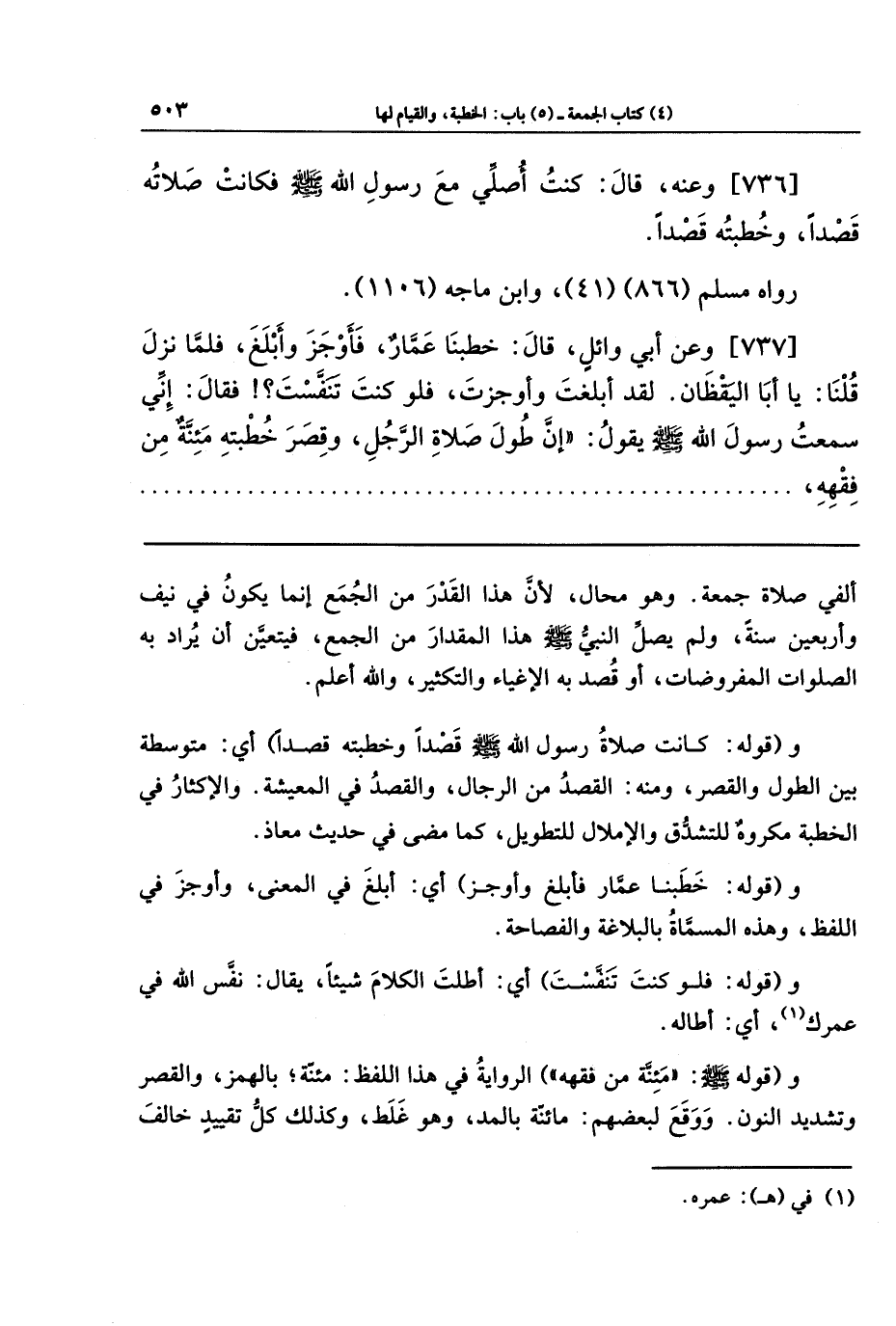 [736]- وَعَنه قَالَ: كُنتُ أُصَلِّي مَعَ رَسُولِ اللهِ - صلى الله عليه وسلم - فَكَانَت صَلاتُهُ قَصدًا، وَخُطبَتُهُ قَصدًا.