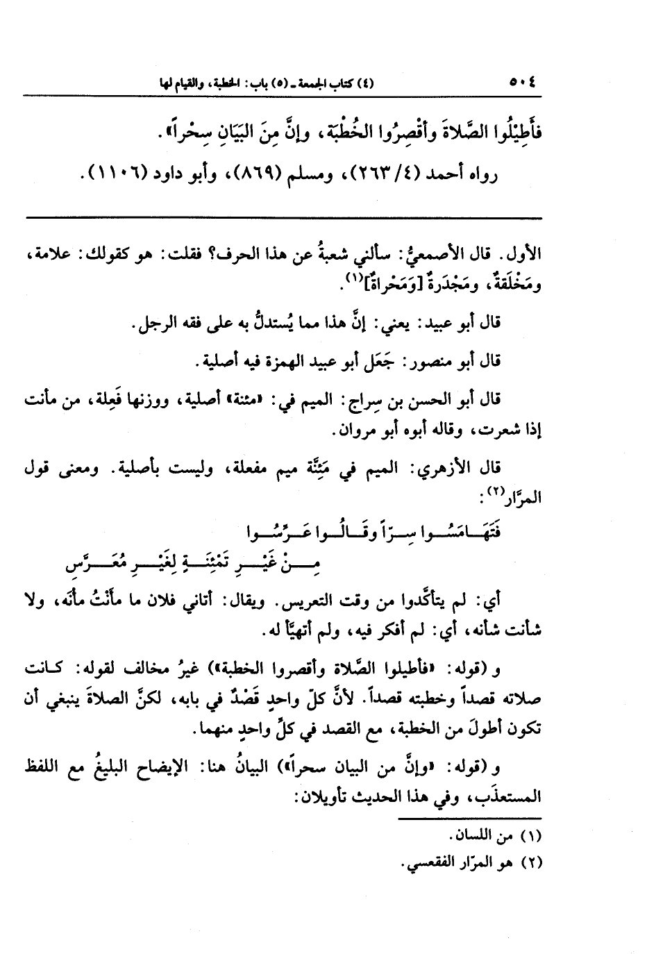 فَأَطِيلُوا الصَّلاةَ وَأقصِرُوا الخُطبَةَ، وَإِنَّ مِنَ البَيَانِ سِحرًا.