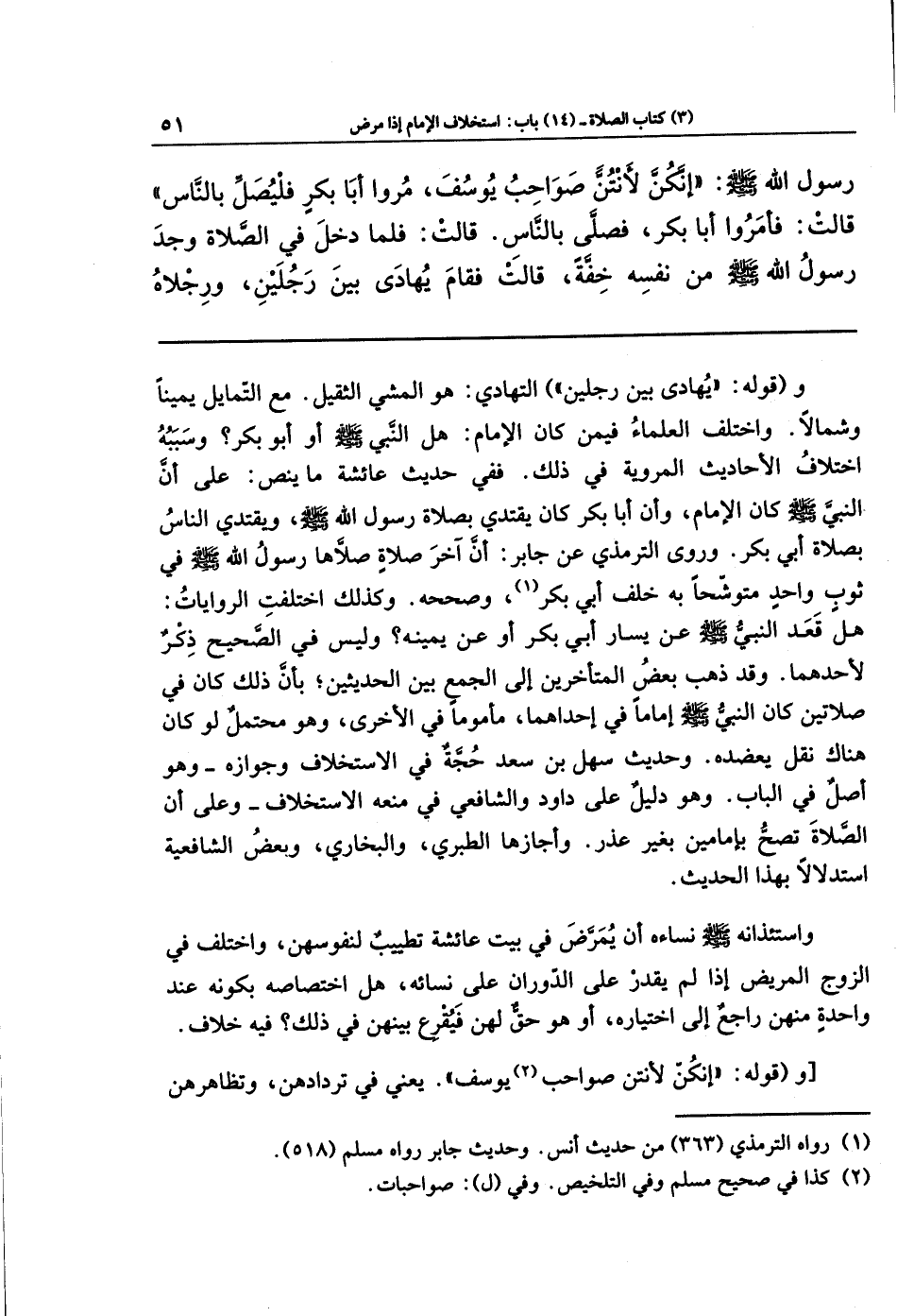 واختلف العلماء فيمن كان الإمام؛ هل النبي - صلى الله عليه وسلم - أو أبو بكر؟ وسببه اختلاف الأحاديث المرويَّة في ذلك؛ ففي حديث عائشة ما ينص على أن النبي - صلى الله عليه وسلم - كان الإمام وأن أبا بكر كان يقتدي بصلاة رسول الله صلى الله عليه وسلم ويقتدي الناس بصلاة أبي بكر. وروى الترمذي عن جابر أن آخر صلاة صلاها رسول الله - صلى الله عليه وسلم - في ثوب واحد مُتَوشِّحًا به خلف أبي بكر (¬1)، وصححه. وكذلك اختلفت الروايات؛ هل قعد النبي - صلى الله عليه وسلم - عن يسار أبي بكر أو عن يمينه؟ وليس في الصحيح ذكر لأحدهما، وقد ذهب بعض المتأخرين إلى الجمع بين الحديثين بأن ذلك كان في صلاتين كان النبي - صلى الله عليه وسلم - إمامًا في إحداهما مأمومًا في الأخرى، وهو محتمل لو كان هناك نقل يعضُده. وحديث سهل بن سعد حُجَّة في الاستخلاف وجوازه، وهو أصل في الباب، وهو دليل على داود والشافعي في منعه الاستخلاف، وعلى أن الصلاة تصح بإمامين بغير عذر، وأجازها الطبري والبخاري وبعض الشافعية استدلالا بهذا الحديث.