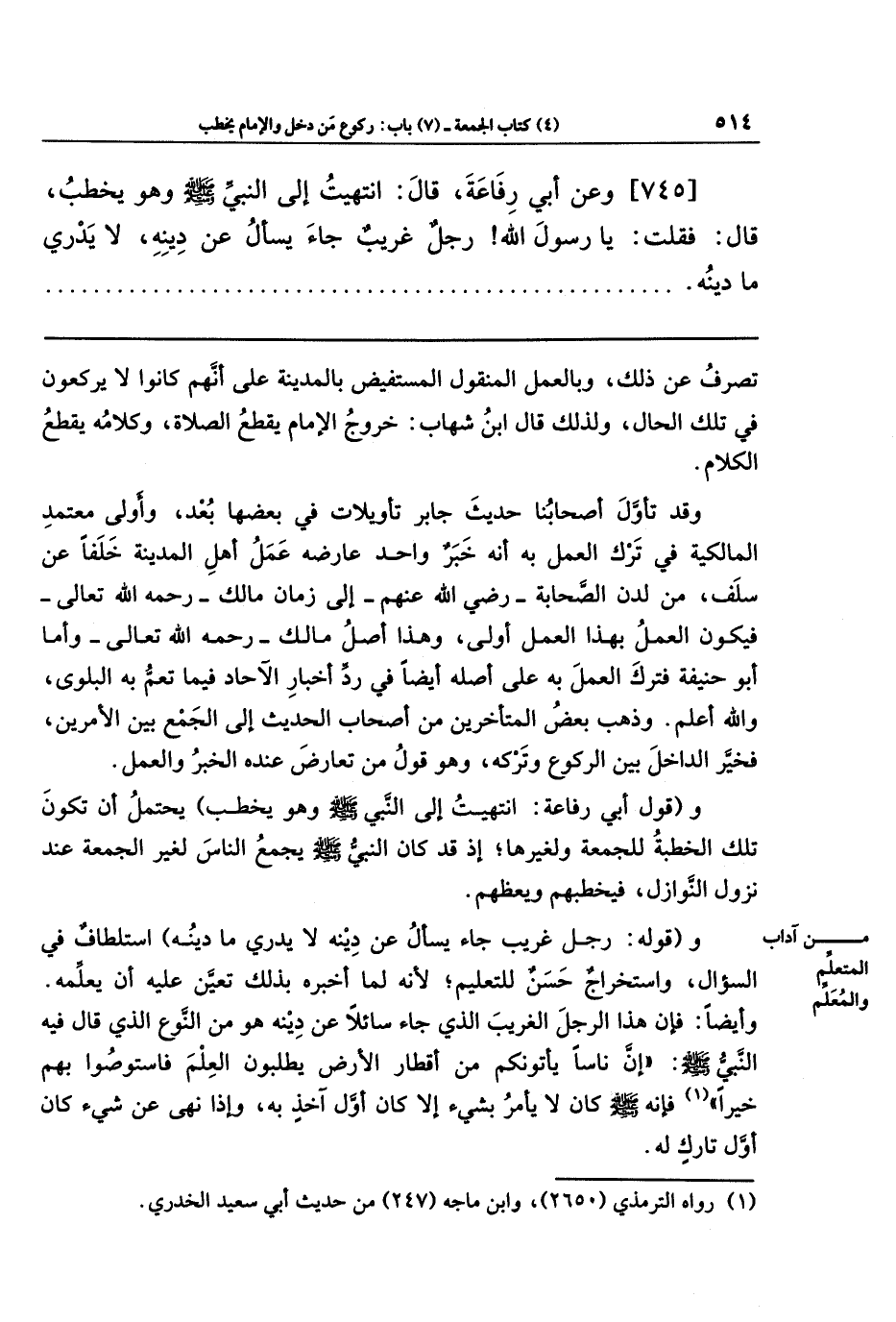 [745]- وَعَن أَبِي رِفَاعَةَ قَالَ: انتَهَيتُ إِلَى النَّبِيِّ - صلى الله عليه وسلم - وَهُوَ يَخطُبُ، قَالَ: فَقُلتُ: يَا رَسُولَ اللهِ! رَجُلٌ غَرِيبٌ جَاءَ يَسأَلُ عَن دِينِهِ، لا يَدرِي مَا دِينُهُ.