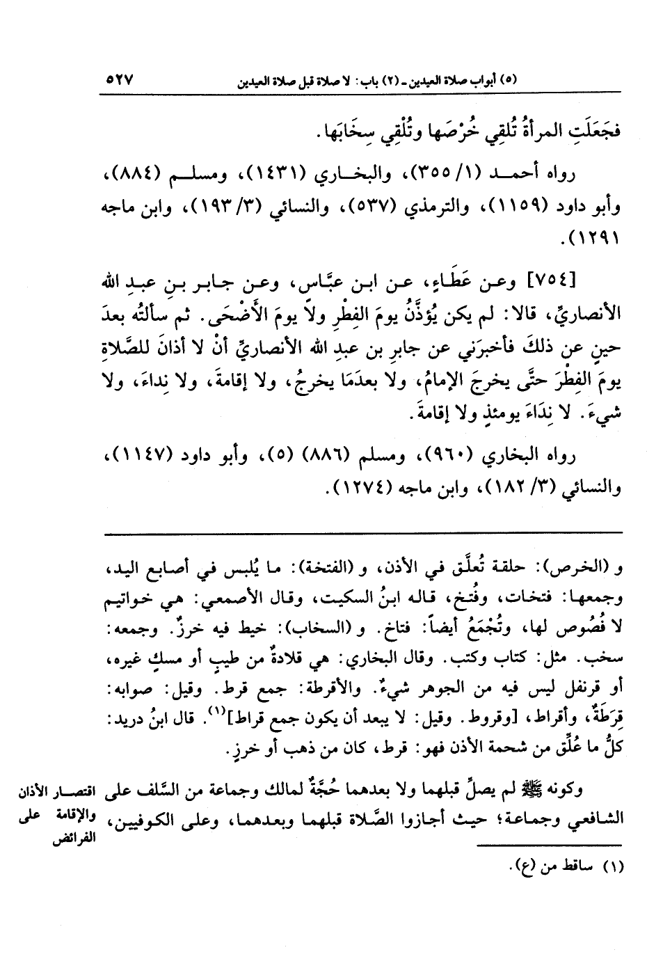[754]- وَعَن عَطَاء، عَنِ ابنِ عَبَّاسٍ، وَعَن جَابِرِ بنِ عَبدِ الله الأَنصَارِيِّ، قَالا: لَم يَكُن يُؤَذَّنُ يَومَ الفِطرِ وَلا يَومَ الأَضحَى. ثُمَّ سَأَلتُهُ بَعدَ حِينٍ عَن ذَلِكَ فَأَخبَرَنِي عَن جَابِرُ بنُ عَبدِ الله الأَنصَارِيُّ: أَن لا أَذَانَ لِلصَّلاةِ يَومَ الفِطرِ حتى يَخرُج الإِمَامُ، وَلا بَعدَمَا يَخرُجُ، وَلا إِقَامَةَ، وَلا نِدَاءَ، وَلا شَيءَ. لا نِدَاءَ يَومَئِذٍ وَلا إِقَامَةَ.