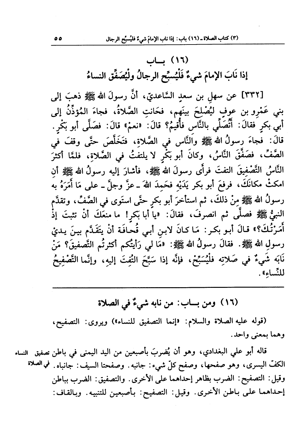 [332]- عَن سَهلِ بنِ سَعدٍ السَّاعِدِيِّ أَنَّ رَسُولَ اللهِ - صلى الله عليه وسلم - ذَهَبَ إِلَى بَنِي عَمرِو بنِ عَوفٍ لِيُصلِحَ بَينَهُم، فَحَانَتِ الصَّلاةُ، فَجَاءَ المُؤَذِّنُ إِلَى أَبِي بَكرٍ فَقَالَ: أَتُصَلِّي بِالنَّاسِ فَأُقِيمُ؟ قَالَ: نَعَم. قَالَ: فَصَلَّى أَبُو بَكرٍ. قَالَ: فَجَاءَ رَسُولُ اللهِ - صلى الله عليه وسلم - وَالنَّاسُ فِي الصَّلاةِ، فَتَخَلَّصَ حَتَّى وَقَفَ فِي الصَّفِّ، فَصَفَّقَ النَّاسُ، وَكَانَ أَبُو بَكرٍ لا يَلتَفِتُ فِي الصَّلاةِ، فَلَمَّا أَكثَرَ النَّاسُ التَّصفِيقَ التَفَتَ فَرَأَى رَسُولَ اللهِ صلى الله عليه وسلم، فَأَشَارَ إِلَيهِ رَسُولُ اللهِ - صلى الله عليه وسلم - أَنِ امكُث مَكَانَكَ، فَرَفَعَ أَبُو بَكرٍ يَدَيهِ فَحَمِدَ اللهَ - عَزَّ وَجَلَّ - عَلَى مَا أَمَرَهُ بِهِ رَسُولُ اللهِ - صلى الله عليه وسلم - مِن ذَلِكَ، ثُمَّ استَأخَرَ أَبُو بَكرٍ حَتَّى استَوَى فِي الصَّفِّ، وَتَقَدَّمَ النَّبِيُّ - صلى الله عليه وسلم - فصَلَّى ثُمَّ انصَرَفَ، فَقَالَ: يَا أَبَا بَكرٍ، مَا مَنَعَكَ أَن تَثبُتَ إِذ أَمَرتُكَ؟ قَالَ أَبُو بَكرٍ: مَا كَانَ لابنِ أَبِي قُحَافَةَ أَن يتقدم بَينَ يَدَي رَسُولِ اللهِ صلى الله عليه وسلم! فَقَالَ رَسُولُ اللهِ صلى الله عليه وسلم: مَا لِي رَأَيتُكُم أَكثَرتُمُ التَّصفِيقَ؟ مَن نَابَهُ شَيءٌ فِي صَلاتِهِ فَليُسَبِّح، فَإِنَّهُ إِذَا سَبَّحَ التُفِتَ إِلَيهِ، وَإِنَّمَا التَّصفِيحُ لِلنِّسَاءِ.