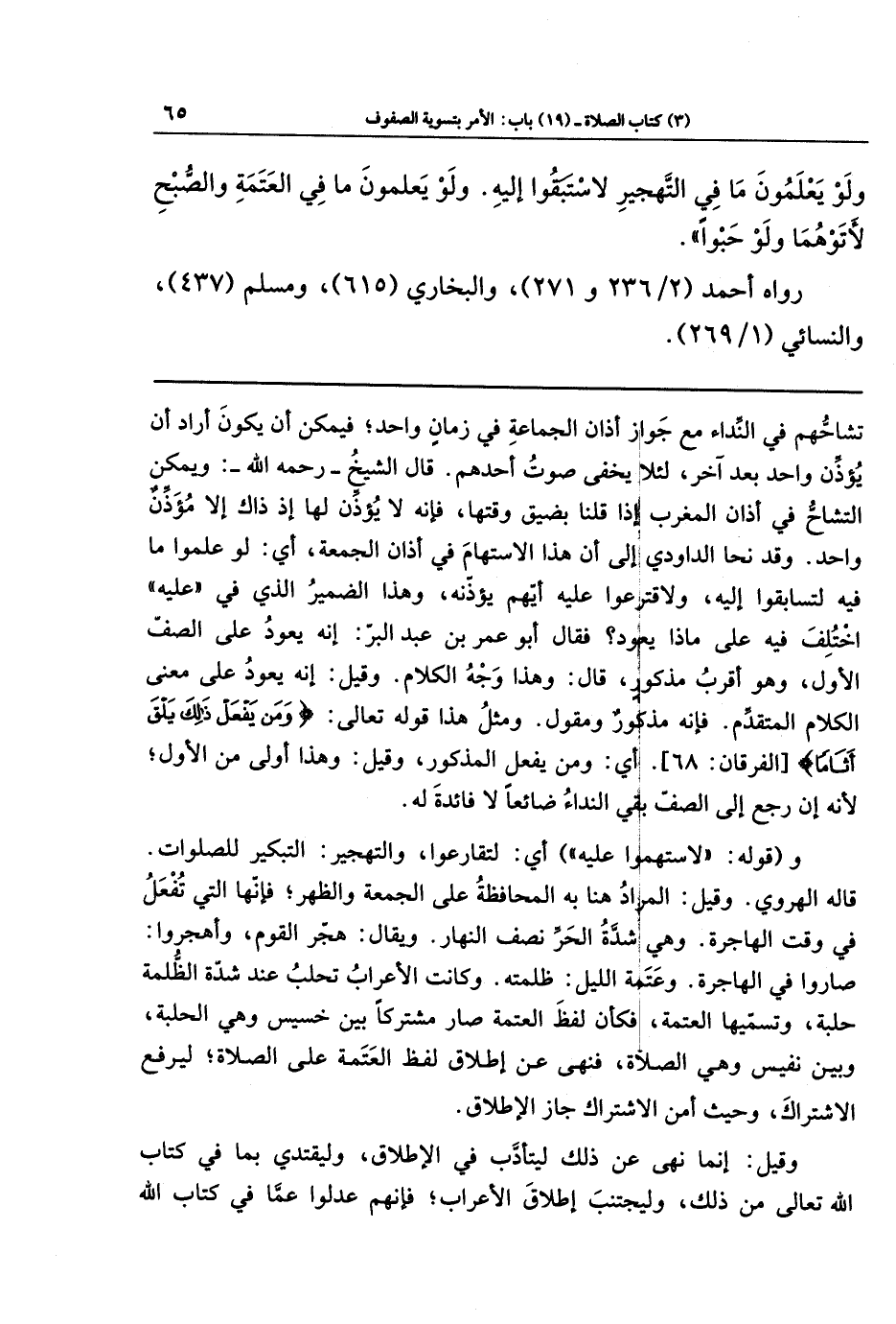قال الشيخ رحمه الله: ويمكن التشاحُّ في أذان المغرب إذا قلنا بضيق وقتها، فإنه لا يؤذِّن لها إذ ذاك إلا مؤذن واحد. وقد نحا الداودي إلى أن هذا الاستِهام في أذان الجمعة؛ أي: لو علموا ما فيه لتسابقوا إليه ولاقترعوا عليه أيهم يؤذِّنه، وهذا الضمير الذي في عليه اختلف فيه على ماذا يعود؟ فقال أبو عمر بن عبد البر: إنه يعود على الصف الأول، وهو أقرب مذكور. قال: وهذا وجه الكلام. وقيل: إنه يعود على معنى الكلام المتقدم؛ فإنه مذكور ومَقُول، ومثل هذا قوله تعالى: {وَمَن يَفعَل ذَلِكَ يَلقَ أَثَامًا}؛ أي: ومن يفعل المذكور، وقيل - وهذا أولى من الأول؛ لأنه إن رجع إلى الصف بقي النداء ضائعًا لا فائدة له.