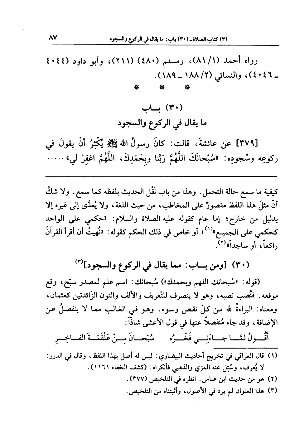 (484) (217) [379]- عَن عَائِشَةَ، قَالَت: كَانَ رَسُولُ اللهِ - صلى الله عليه وسلم - يُكثِرُ أَن يَقُولَ فِي رُكُوعِهِ وَسُجُودِهِ: سُبحَانَكَ اللهُمَّ رَبَّنَا وَبِحَمدِكَ، اللهُمَّ اغفِر لِي