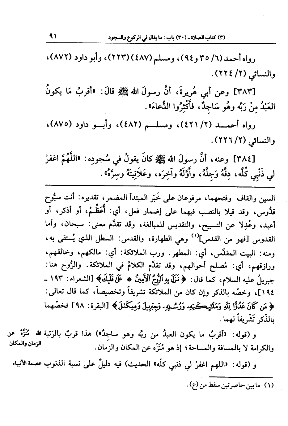 [383]- وَعَن أَبِي هُرَيرَةَ، أَنَّ رَسُولَ اللهِ - صلى الله عليه وسلم - قَالَ: أَقرَبُ مَا يَكُونُ العَبدُ مِن رَبِّهِ وَهُوَ سَاجِدٌ، فَأَكثِرُوا الدُّعَاءَ.