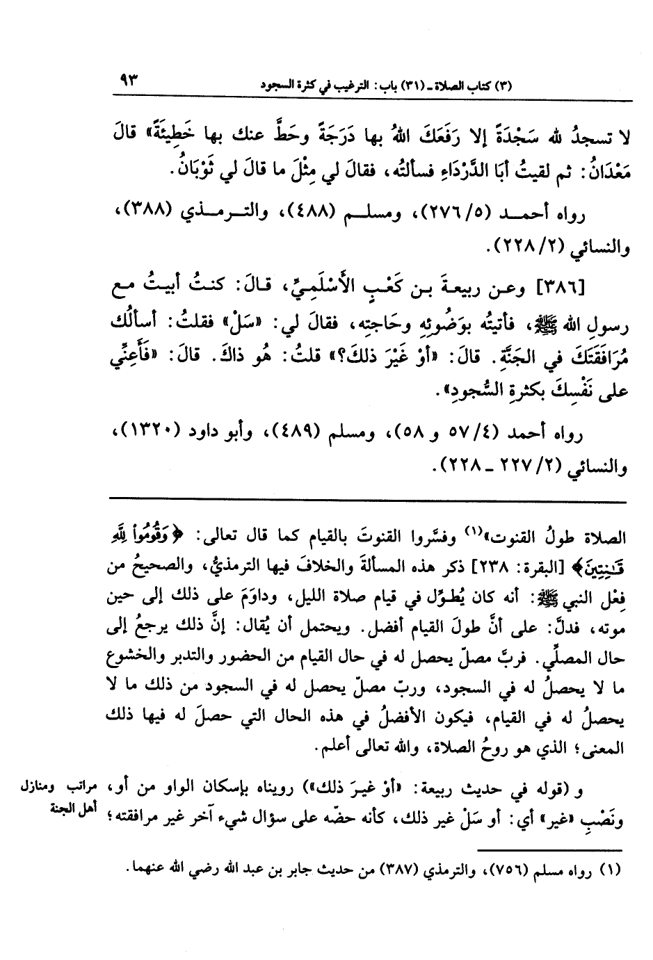 [386]- وَعَن رَبِيعَةَ بنِ كَعبٍ الأَسلَمِيِّ؛ قَال: كُنتُ أَبِيتُ مَعَ رَسُولِ اللهِ - صلى الله عليه وسلم -، فأتيته بِوَضُوئِهِ وَحَاجَتِهِ، فَقَالَ لِي: سَل فَقُلتُ: أَسأَلُكَ مُرَافَقَتَكَ فِي الجَنَّةِ. قَالَ: أَو غَيرَ ذَلِكَ؟ قُلتُ: هُوَ ذَاكَ، قَالَ: فَأَعِنِّي عَلَى نَفسِكَ بِكَثرَةِ السُّجُودِ.