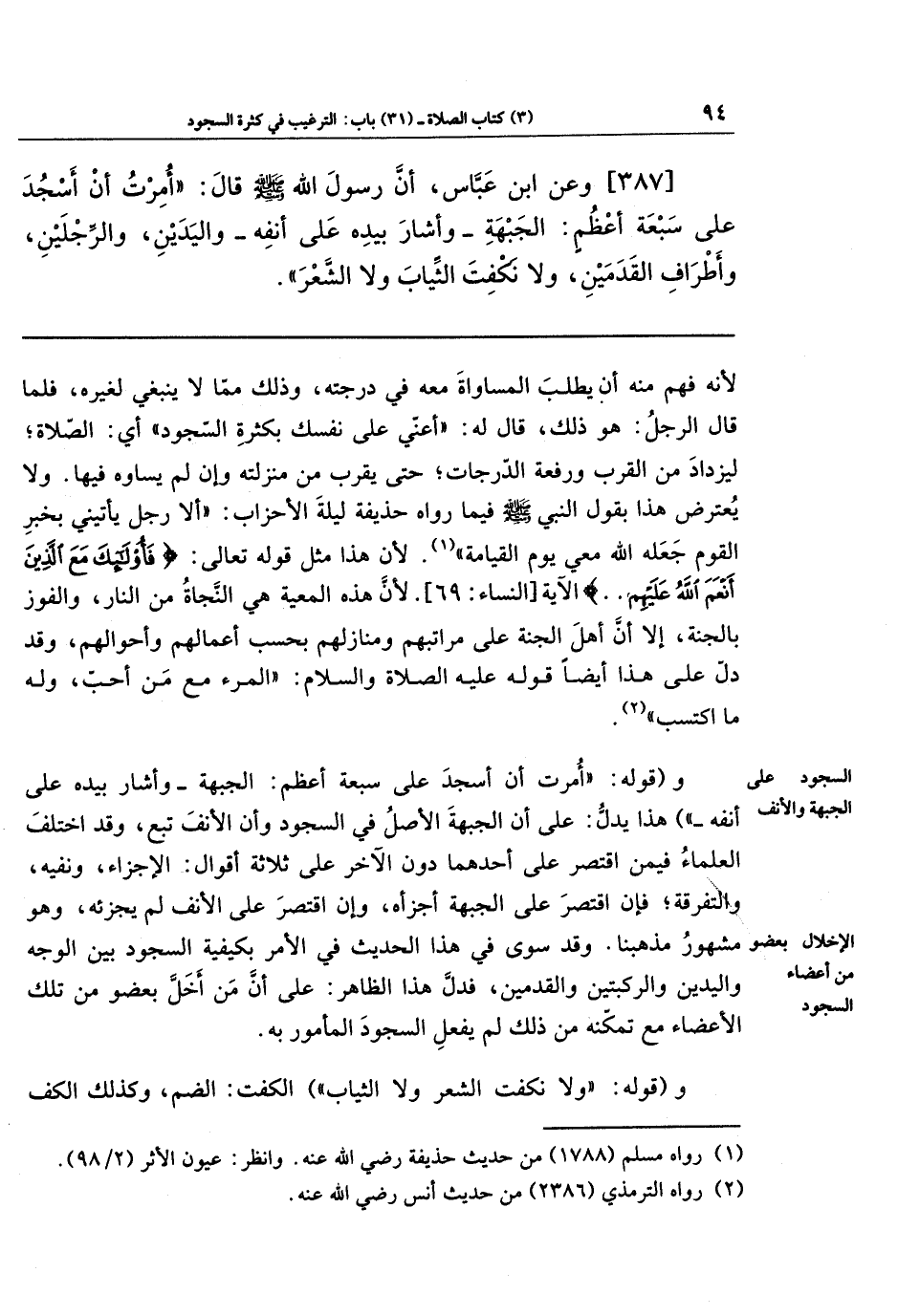 [387]- وَعَنِ ابنِ عَبَّاسٍ، أَنَّ رَسُولَ اللهِ - صلى الله عليه وسلم - قَالَ: أُمِرتُ أَن أَسجُدَ عَلَى سَبعَةِ أَعظُمٍ: الجَبهَةِ - وَأَشَارَ بِيَدِهِ على أَنفِهِ - وَاليَدَينِ، وَالرِّجلَينِ، وَأَطرَافِ القَدَمَينِ، وَلا نَكفِتَ الثِّيَابَ وَلا الشَّعرَ.