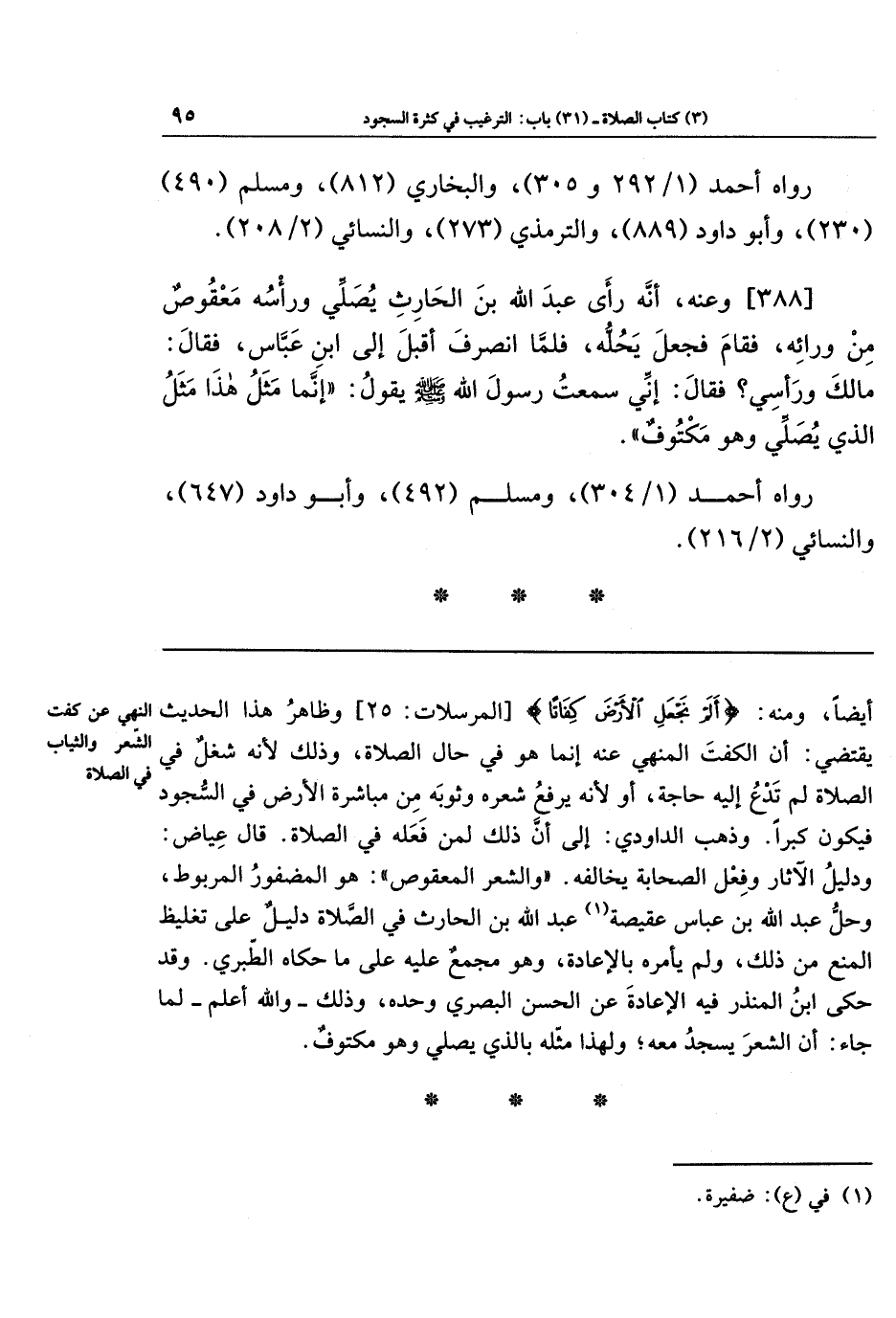 [388]- وَعَنهُ، أَنَّه رَأَى عَبدَ اللهِ بنَ الحَارِثِ يُصَلِّي وَرَأسُهُ مَعقُوصٌ مِن وَرَائِه، فَقَامَ فَجَعَلَ يَحُلُّهُ، فَلَمَّا انصَرَفَ أَقبَلَ إِلَى ابنِ عَبَّاسٍ، فَقَالَ: مَا لَكَ وَرَأسِي؟ فَقَالَ: إِنِّي سَمِعتُ رَسُولَ اللهِ - صلى الله عليه وسلم - يَقُولُ: إِنَّمَا مَثَلُ هَذَا مَثَلُ الَّذِي يُصَلِّي وَهُوَ مَكتُوفٌ.