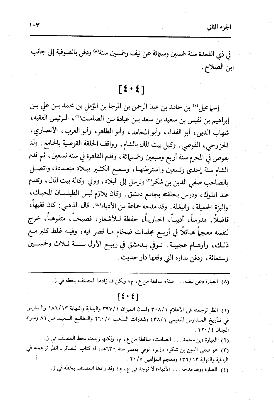 404 - إِسْمَاعِيل بن حَامِد بن عبد الرَّحْمَن بن المرجا بن المؤمل بن مُحَمَّد بن عَليّ بن إِبْرَاهِيم بن نَفِيس بن سعيد بن سعد بن عبَادَة بن الصَّامِت الرئيس الْفَقِيه شهَاب الدَّين أَبُو الْفِدَاء وَأَبُو المحامد وَأَبُو الطَّاهِر وَأَبُو الْعَرَب الْأنْصَارِيّ الخزرجي القوصي وَكيل بَيت المَال بِالشَّام وواقف الْحلقَة القوصية بالجامع ولد بقوص فِي الْمحرم سنة أَربع وَسبعين وَخَمْسمِائة وَقدم الْقَاهِرَة فِي سنة تسعين ثمَّ قدم الشَّام سنة إِحْدَى وَتِسْعين واستوطنها وَسمع الْكثير بِبِلَاد مُتعَدِّدَة واتصل بالصاحب صفي الدَّين بن شكر وَترسل إِلَى الْبِلَاد وَولي وكَالَة بَيت المَال وَتقدم عِنْد الْمُلُوك ودرس بحلقته بِجَامِع دمشق وَكَانَ يلازم لبس الطيلسان المحبك وَالْبزَّة الجميلة وَالْبَغْلَة وَقد مدحه جمَاعَة من الأدباء قَالَ الذَّهَبِيّ كَانَ فَقِيها فَاضلا مدرسا أديبا اخباريا حفظَة للأشعار فصيحا متفوها خرج لنَفسِهِ معجما هائلا فِي أَربع مجلدات ضخام مَا قصر فِيهِ وَفِيه غلط كثير مَعَ ذَلِك وأوهام عَجِيبَة توفّي بِدِمَشْق فِي ربيع الأول سنة ثَلَاث وَخمسين وسِتمِائَة وَدفن بداره الَّتِي وَقفهَا دَار حَدِيث