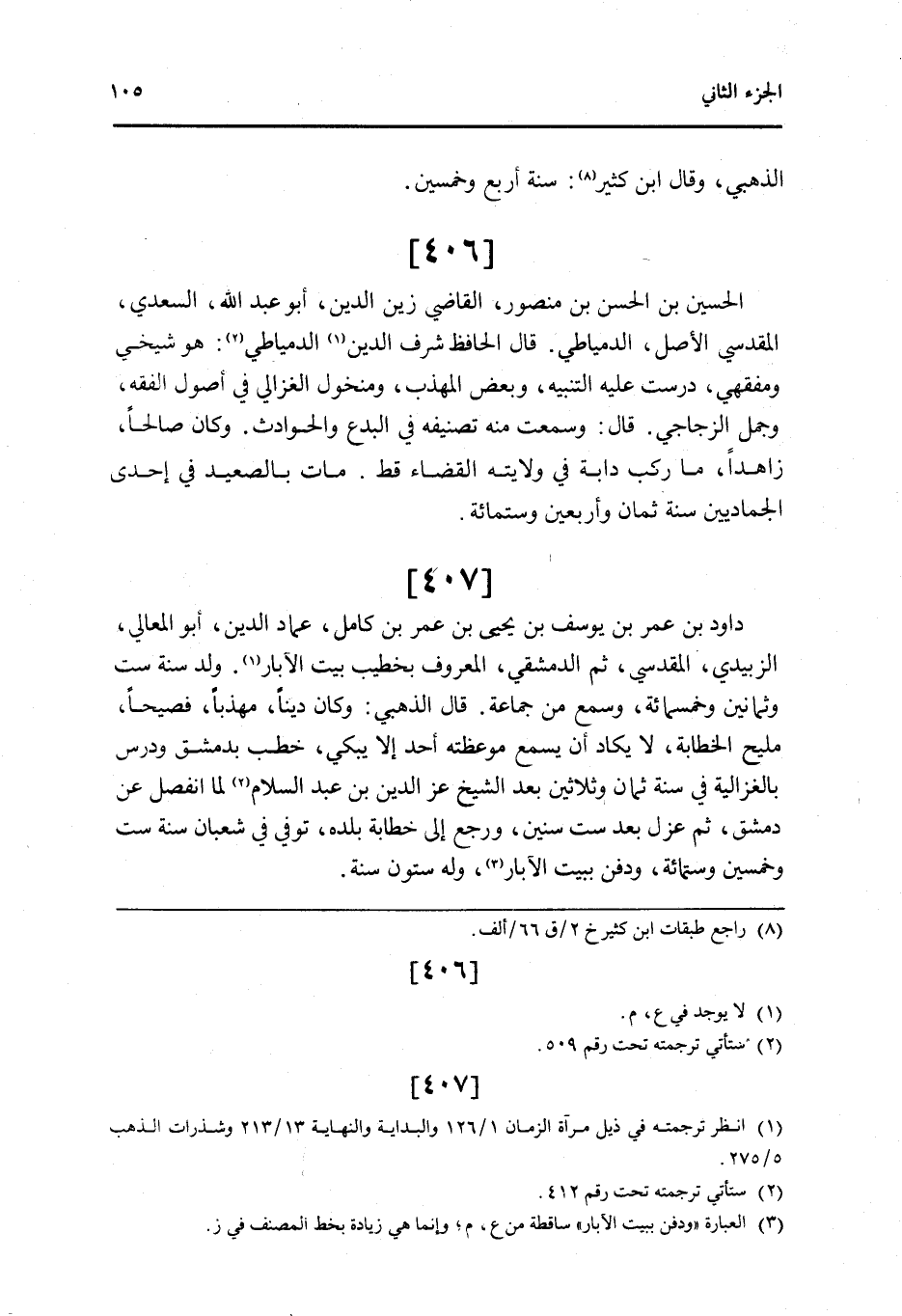 406 - الْحُسَيْن بن الْحسن بن مَنْصُور القَاضِي زين الدَّين أَبُو عبد الله السَّعْدِيّ الْمَقْدِسِي الأَصْل الدمياطي قَالَ الْحَافِظ شرف الدَّين الدمياطي هُوَ شَيْخي ومفقهي درست عَلَيْهِ التَّنْبِيه وَبَعض الْمُهَذّب ومنخول الْغَزالِيّ فِي أصُول الْفِقْه وجمل الزجاجي قَالَ وَسمعت مِنْهُ تصنيفه فِي الْبدع والحوادث وَكَانَ صَالحا زاهدا مَا ركب دَابَّة فِي ولَايَته الْقَضَاء قطّ مَاتَ بالصعيد فِي إِحْدَى الجماديين سنة ثَمَان وَأَرْبَعين وسِتمِائَة