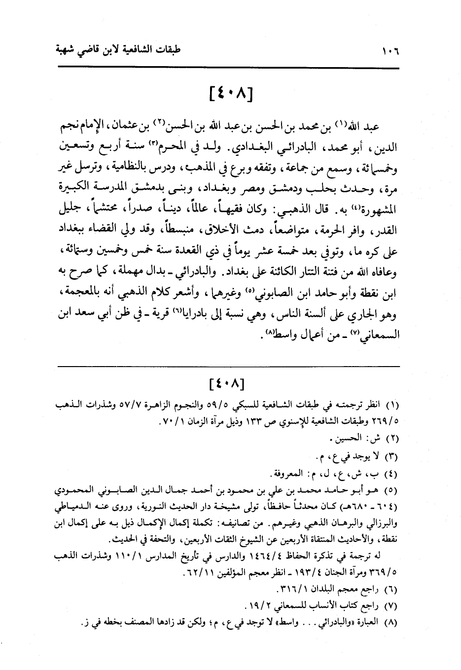 408 - عبد الله بن مُحَمَّد بن الْحسن بن عبد الله بن الْحسن بن عُثْمَان الإِمَام نجم الدَّين أَبُو مُحَمَّد البادرائي الْبَغْدَادِيّ ولد فِي الْمحرم سنة أَربع وَتِسْعين وَخَمْسمِائة وَسمع من جمَاعَة وتفقه وبرع فِي الْمَذْهَب ودرس بالنظامية وَترسل غير مرّة وَحدث بحلب ودمشق ومصر وبغداد وَبنى بِدِمَشْق الْمدرسَة الْكَبِيرَة الْمَشْهُورَة بِهِ قَالَ الذَّهَبِيّ وَكَانَ فَقِيها عَالما دينا صَدرا محتشما جليل الْقدر وافر الْحُرْمَة متواضعا دمث الْأَخْلَاق منبسطا وَقد ولي الْقَضَاء بِبَغْدَاد على كره مَا وَتُوفِّي بعد خَمْسَة عشر يَوْمًا فِي ذِي الْقعدَة سنة خمس وَخمسين وسِتمِائَة وَعَافَاهُ الله من فتْنَة التتار الكائنة على بَغْدَاد والبادرائي بدال مُهْملَة كَمَا صرح بِهِ ابْن نقطة وَأَبُو حَامِد ابْن الصَّابُونِي وَغَيرهمَا وأشعر كَلَام الذَّهَبِيّ أَنه بِالْمُعْجَمَةِ وَهُوَ الْجَارِي على أَلْسِنَة النَّاس وَهِي نِسْبَة إِلَى بادرايا قَرْيَة فِي ظن أبي سعد ابْن السَّمْعَانِيّ من إِعْمَال وَاسِط