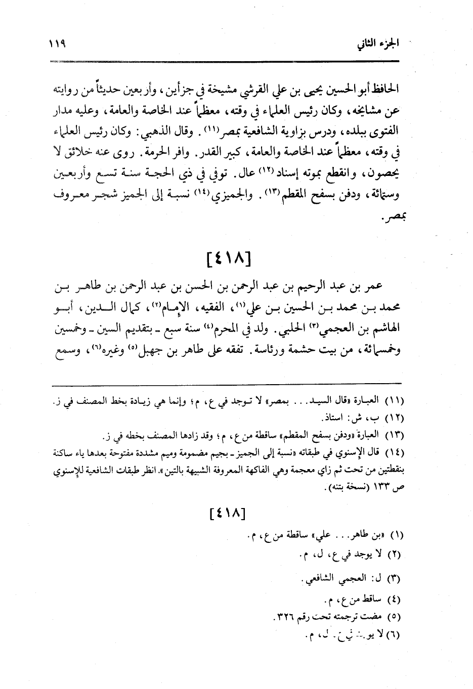 418 - عمر بن عبد الرَّحِيم بن عبد الرَّحْمَن بن الْحسن بن عبد الرَّحْمَن بن طَاهِر بن مُحَمَّد بن مُحَمَّد بن الْحُسَيْن بن عَليّ الْفَقِيه الإِمَام كَمَال الدَّين أَبُو الهاشم بن العجمي الْحلَبِي ولد فِي الْمحرم سنة سبع بِتَقْدِيم السِّين وَخمسين وَخَمْسمِائة من بَيت حشمة ورئاسة تفقه على طَاهِر بن جهبل وَغَيره وَسمع
