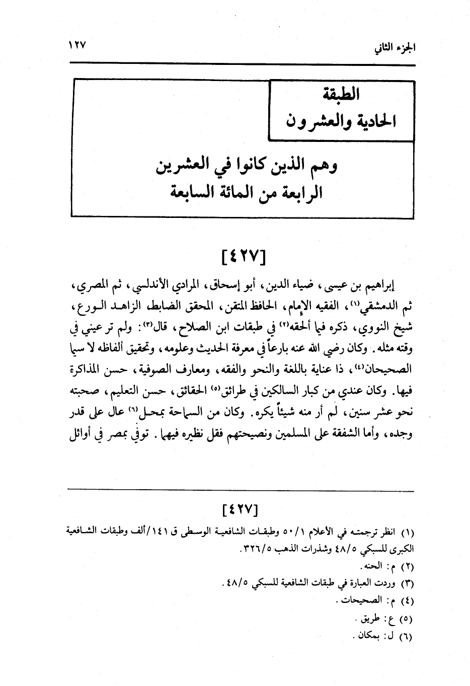 427 - إِبْرَاهِيم بن عِيسَى ضِيَاء الدَّين أَبُو إِسْحَاق الْمرَادِي الأندلسي ثمَّ الْمصْرِيّ ثمَّ الدِّمَشْقِي الْفَقِيه الإِمَام الْحَافِظ المتقن الْمُحَقق الضَّابِط الزَّاهِد الْوَرع شيخ النَّوَوِيّ ذكره فِيمَا ألحقهُ فِي طَبَقَات ابْن الصّلاح قَالَ وَلم تَرَ عَيْني فِي وقته مثله وَكَانَ رَضِي الله عَنهُ بارعا فِي معرفَة الحَدِيث وعلومه وَتَحْقِيق أَلْفَاظه لَا سِيمَا الصحيحان ذَا عناية باللغة والنحو وَالْفِقْه ومعارف الصُّوفِيَّة حسن المذاكرة فِيهَا وَكَانَ عِنْدِي من كبار السالكين فِي طرائق الْحَقَائِق حسن التَّعْلِيم صحبته نَحْو عشر سِنِين لم أر مِنْهُ شَيْئا يكره وَكَانَ من السماحة بِمحل عَال على قدر وجده وَأما الشَّفَقَة على الْمُسلمين ونصيحتهم فَقل نَظِيره فيهمَا توفّي بِمصْر فِي أَوَائِل
