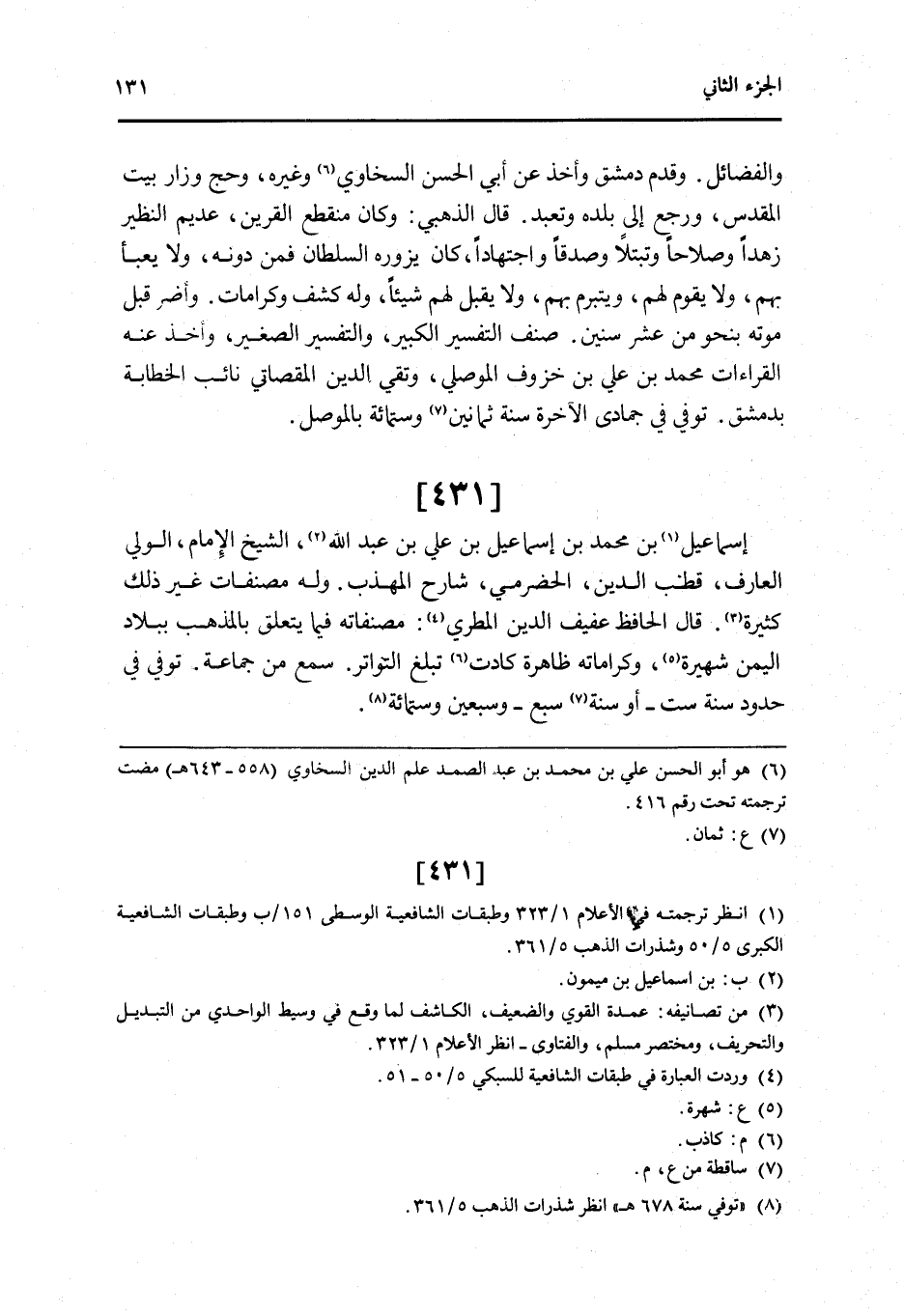 431 - إِسْمَاعِيل بن مُحَمَّد بن إِسْمَاعِيل بن على بن عبد الله الشَّيْخ الإِمَام الْوَلِيّ الْعَارِف قطب الدَّين الْحَضْرَمِيّ شَارِح الْمُهَذّب وَله مصنفات غير ذَلِك كَثِيرَة قَالَ الْحَافِظ عفيف الدَّين المطري مصنفاته فِيمَا يتَعَلَّق بِالْمذهبِ بِبِلَاد الْيمن شهيرة وكراماته ظَاهِرَة كَادَت تبلغ التَّوَاتُر سمع من جمَاعَة توفّي فِي حُدُود سنة سِتّ أَو سنة سبع وَسبعين وسِتمِائَة