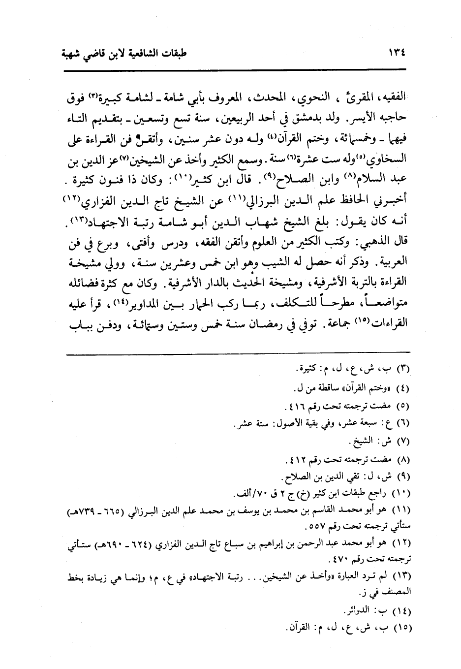 الْفَقِيه المقرىء النَّحْوِيّ الْمُحدث الْمَعْرُوف بِأبي شامة لشامة كَبِيرَة فَوق حَاجِبه الْأَيْسَر ولد بِدِمَشْق فى أحد الربيعين سنة تسع وَتِسْعين بِتَقْدِيم التَّاء فيهمَا وَخَمْسمِائة وَختم الْقُرْآن وَله دون عشر سِنِين وأتقن فن الْقِرَاءَة على السخاوي وَله سِتّ عشرَة سنة وَسمع الْكثير وَأخذ عَن الشَّيْخَيْنِ عز الدَّين بن عبد السَّلَام وَابْن الصّلاح قَالَ ابْن كثير وَكَانَ ذَا فنون كَثِيرَة أَخْبرنِي الْحَافِظ علم الدَّين البرزالي عَن الشَّيْخ تَاج الدَّين الْفَزارِيّ أَنه كَانَ يَقُول بلغ الشَّيْخ شهَاب الدَّين أَبُو شامة رُتْبَة الِاجْتِهَاد قَالَ الذَّهَبِيّ وَكتب الْكثير من الْعُلُوم وأتقن الْفِقْه ودرس وَأفْتى وبرع فِي فن الْعَرَبيَّة وَذكر أَنه حصل لَهُ الشيب وَهُوَ ابْن خمس وَعشْرين سنة وَولي مشيخة الْقِرَاءَة بالتربة الأشرفية ومشيخة الحَدِيث بِالدَّار الأشرفية وَكَانَ مَعَ كَثْرَة فضائله متواضعا مطرحا للتكلف رُبمَا ركب الْحمار بَين المداوير قَرَأَ عَلَيْهِ الْقرَاءَات جمَاعَة توفّي فِي رَمَضَان سنة خمس وَسِتِّينَ وسِتمِائَة وَدفن بِبَاب