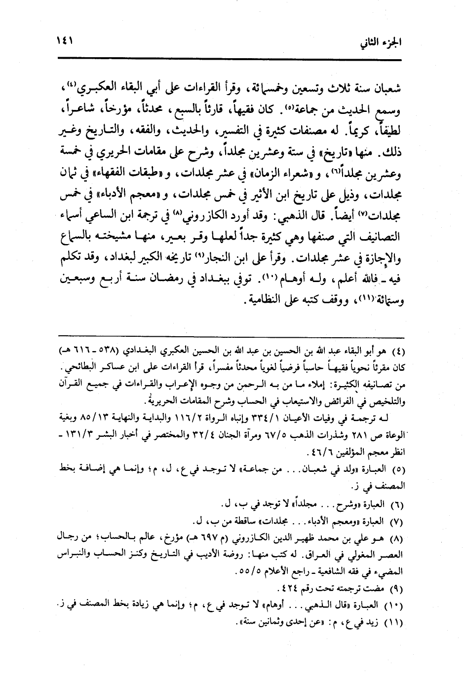 شعْبَان سنة ثَلَاث وَتِسْعين وَخَمْسمِائة وَقَرَأَ الْقرَاءَات على أبي الْبَقَاء العكبري وَسمع الحَدِيث من جمَاعَة كَانَ فَقِيها قَارِئًا بالسبع مُحدثا مؤرخا شَاعِرًا لطيفا كَرِيمًا لَهُ مصنفات كَثِيرَة فِي التَّفْسِير والْحَدِيث وَالْفِقْه والتاريخ وَغير ذَلِك مِنْهَا تَارِيخ فِي سِتَّة وَعشْرين مجلدا وَشرح على مقامات الحريري فِي خَمْسَة وَعشْرين مجلدا وشعراء الزَّمَان فِي عشر مجلدات وطبقات الْفُقَهَاء فِي ثَمَان مجلدات وذيل على تَارِيخ ابْن الْأَثِير فِي خمس مجلدات ومعجم الأدباء فِي خمس مجلدات أَيْضا قَالَ الذَّهَبِيّ وَقد أورد الكازروني فِي تَرْجَمَة ابْن السَّاعِي أَسمَاء التصانيف الَّتِي صنفها وَهِي كَثِيرَة جدا لَعَلَّهَا وقر بعير مِنْهَا مشيخته بِالسَّمَاعِ وَالْإِجَازَة فِي عشر مجلدات وَقَرَأَ على ابْن النجار تَارِيخه الْكَبِير لبغداد وَقد تكلم فِيهِ فَالله أعلم وَله أَوْهَام توفّي بِبَغْدَاد فِي رَمَضَان سنة أَربع وَسبعين وسِتمِائَة ووقف كتبه على النظامية