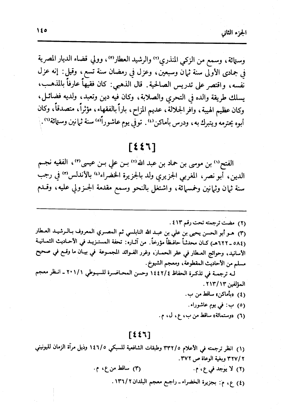 446 - الْفَتْح بن مُوسَى بن حَمَّاد بن عبد الله بن عَليّ بن عِيسَى الْفَقِيه نجم الدَّين أَبُو نصر المغربي الجزيري ولد بالجزيرة الخضراء بالأندلس فِي رَجَب سنة ثَمَان وَثَمَانِينَ وَخَمْسمِائة واشتغل بالنحو وَسمع مُقَدّمَة الْجُزُولِيّ عَلَيْهِ وَقدم