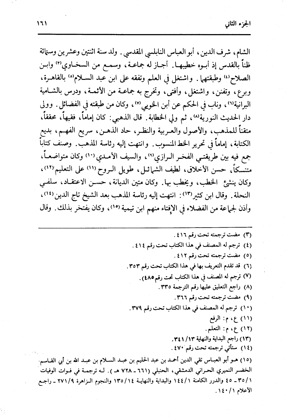 الشَّام شرف الدَّين أَبُو الْعَبَّاس النابلسي الْمَقْدِسِي ولد سنة اثْنَتَيْنِ وَعشْرين وسِتمِائَة ظنا بالقدس إِذْ أَبوهُ خطيبها إجاز لَهُ جمَاعَة وَسمع من السخاوي وَابْن الصّلاح وطبقتهما واشتغل فِي الْعلم وتفقه على ابْن عبد السَّلَام بِالْقَاهِرَةِ وبرع وتفنن واشتغل وَأفْتى وَتخرج بِهِ جمَاعَة من الْأَئِمَّة ودرس بالشامية البرانية وناب فِي الحكم عَن أبن الخوبي وَكَانَ من طبقته فِي الْفَضَائِل وَولى دَار الحَدِيث النورية ثمَّ ولي الخطابة قَالَ الذَّهَبِيّ كَانَ إِمَامًا فَقِيها محققا متقنا للْمَذْهَب وَالْأُصُول والعربية وَالنَّظَر حاد الذِّهْن سريع الْفَهم بديع الْكِتَابَة إِمَامًا فِي تَحْرِير الْخط الْمَنْسُوب وانتهت إِلَيْهِ رئاسة الْمَذْهَب وصنف كتابا جمع فِيهِ بَين طريقتي الْفَخر الرَّازِيّ وَالسيف الْآمِدِيّ وَكَانَ متواضعا متنسكا حسن الْأَخْلَاق لطيف الشَّمَائِل طَوِيل الرّوح على التَّعْلِيم وَكَانَ ينشئ الْخطب ويخطب بهَا وَكَانَ متين الدّيانَة حسن الِاعْتِقَاد سلفي النحلة وَقَالَ ابْن كثير انْتَهَت إِلَيْهِ رئاسة الْمَذْهَب بعد الشَّيْخ تَاج الدَّين وَأذن لجَماعَة من الْفُضَلَاء فِي الْإِفْتَاء مِنْهُم ابْن تَيْمِية وَكَانَ يفتخر بذلك وَقَالَ